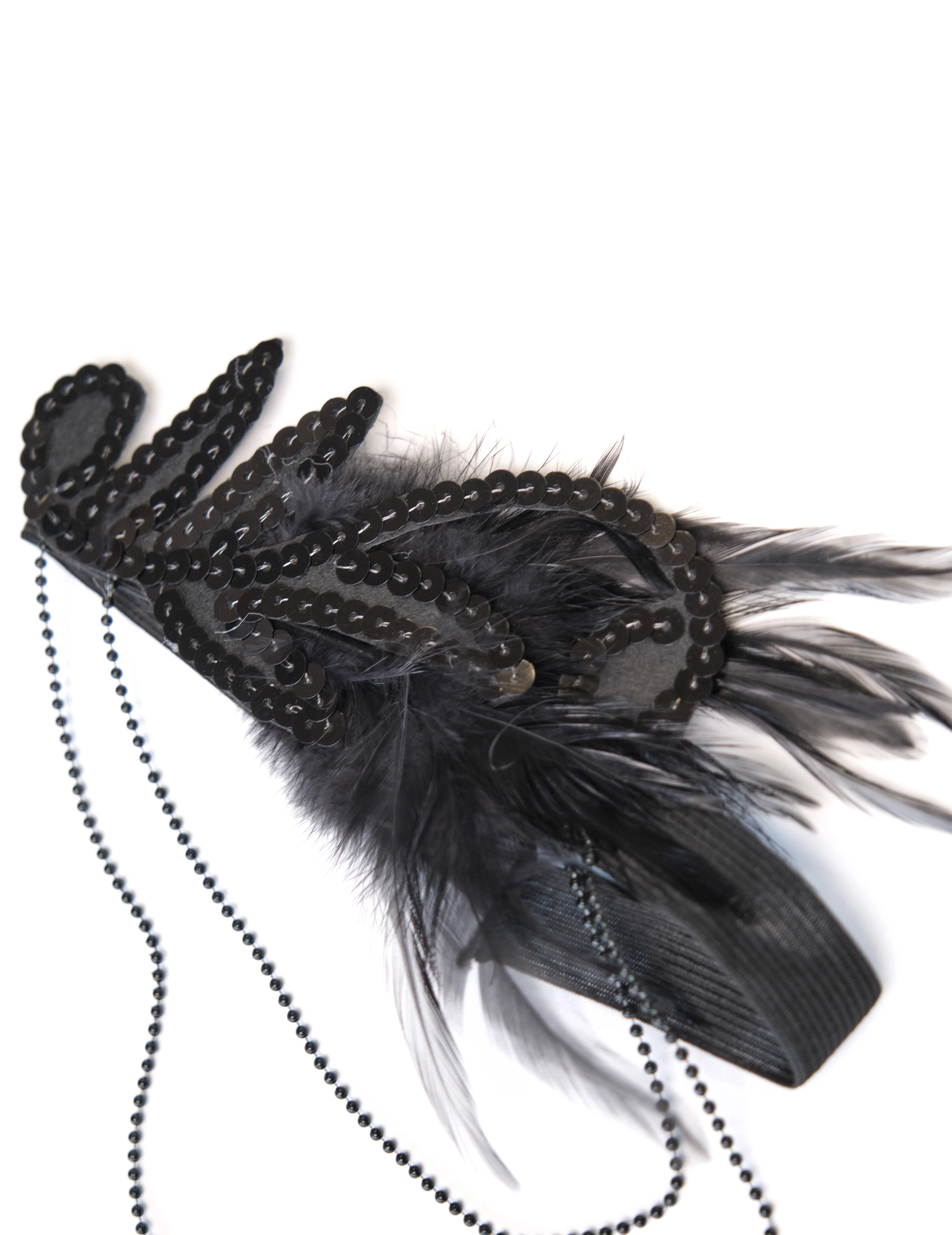 De hoofdband is zwart en versierd met veren. Het is ook versierd met zwarte parels die langs de zijkant van het gezicht naar beneden vallen.