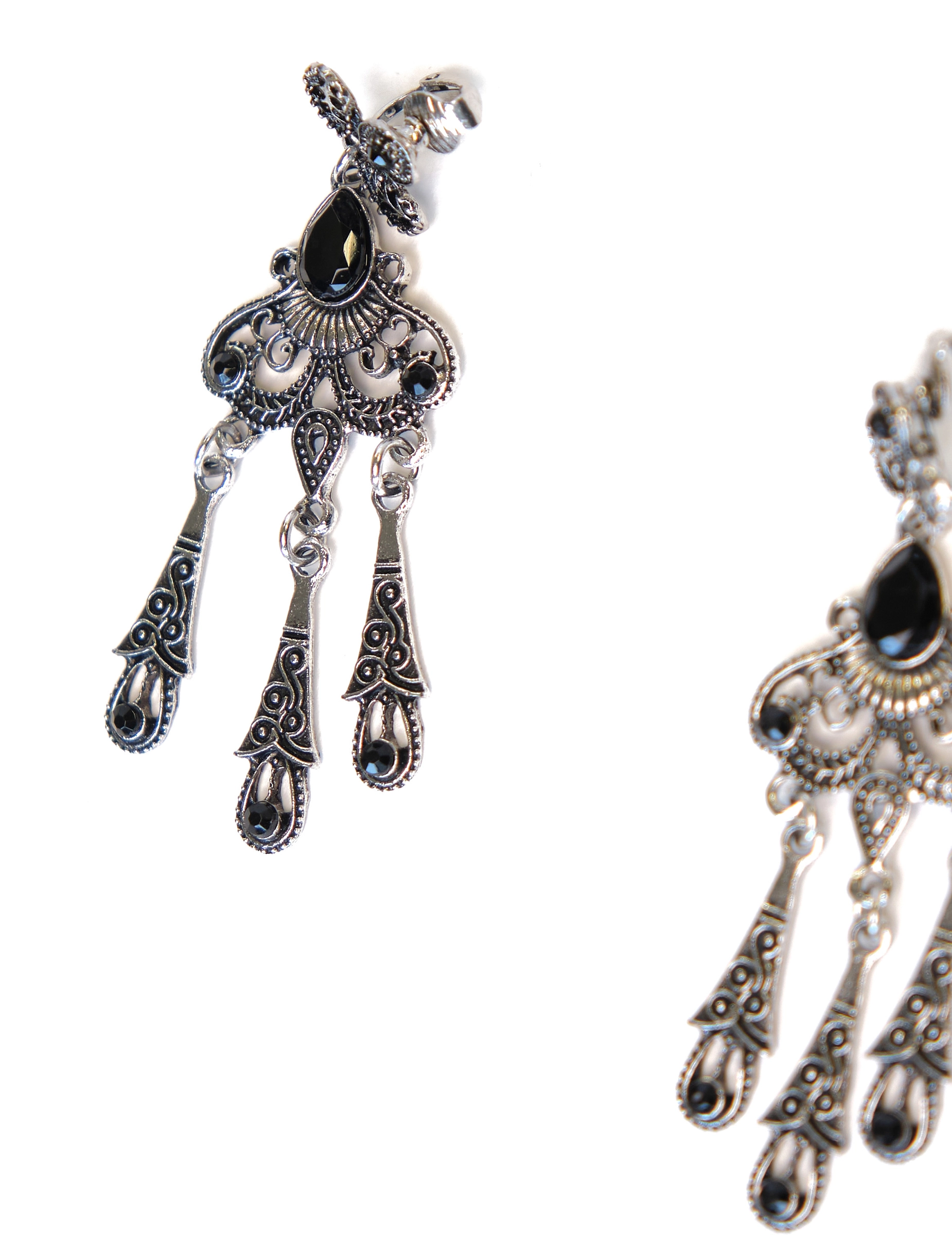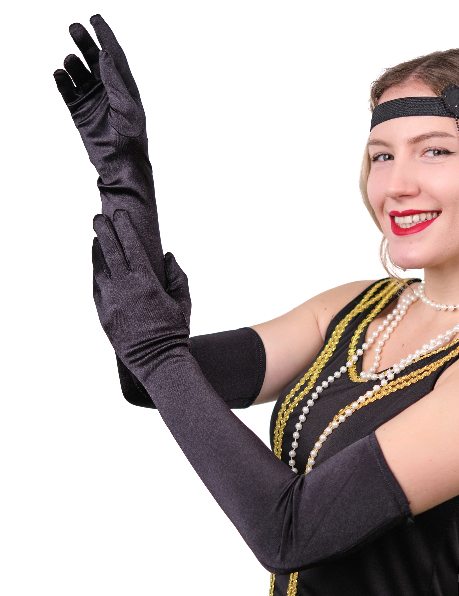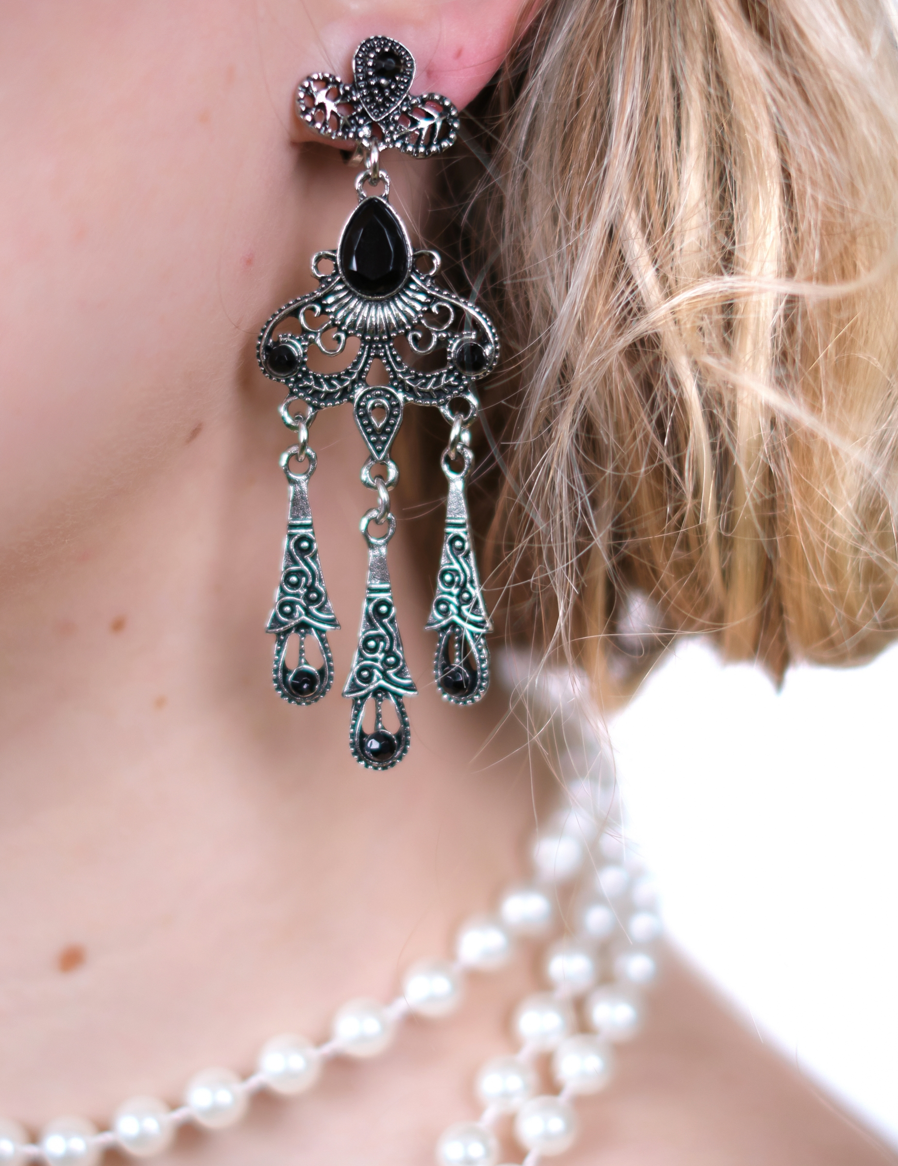 De handschoenen zijn lang en zwart. Ze hebben een satijn effect wat ze een chique uitstraling geeft. De oorbellen zijn zilver en zwart. Ze zijn versierd met valse zwarte stenen.