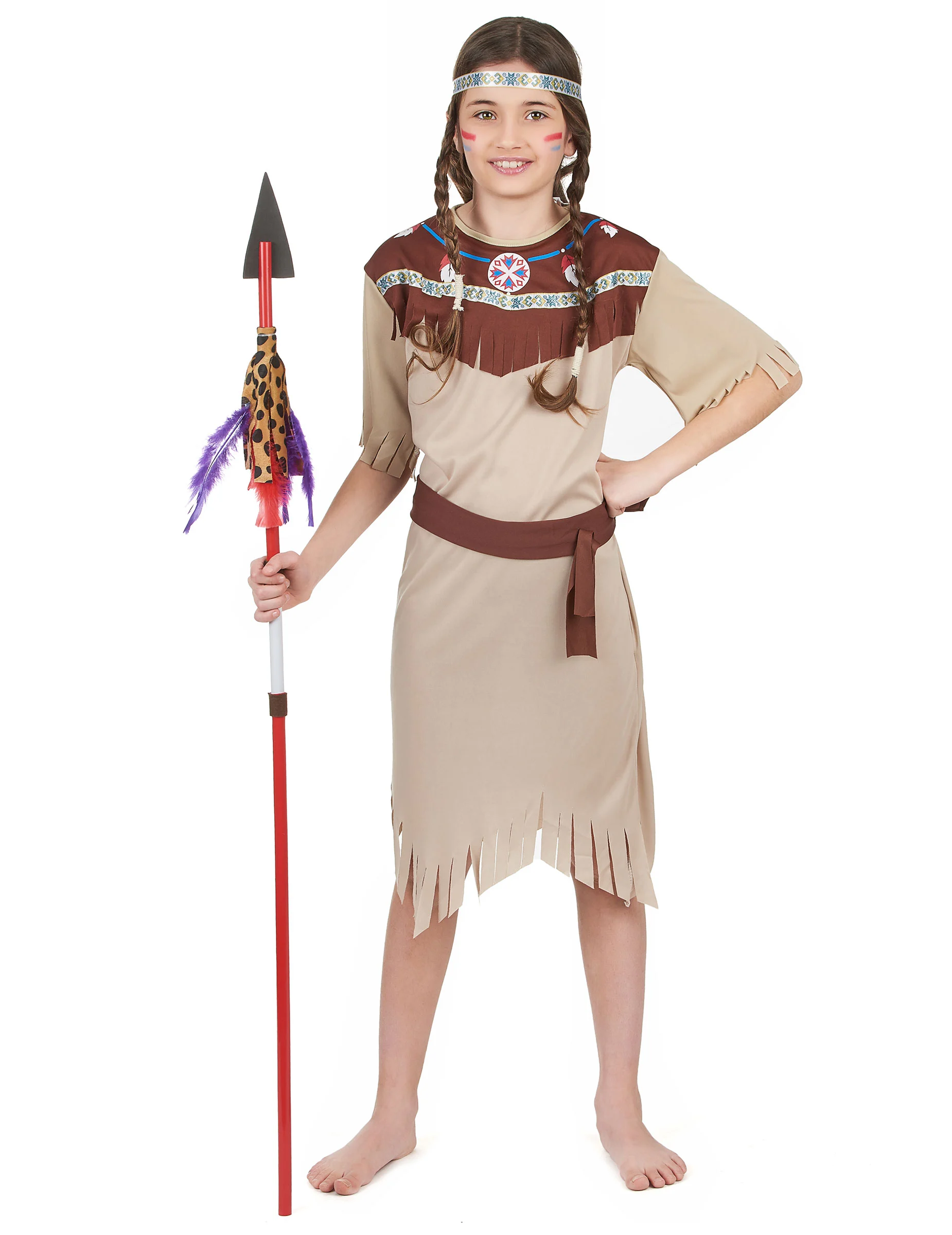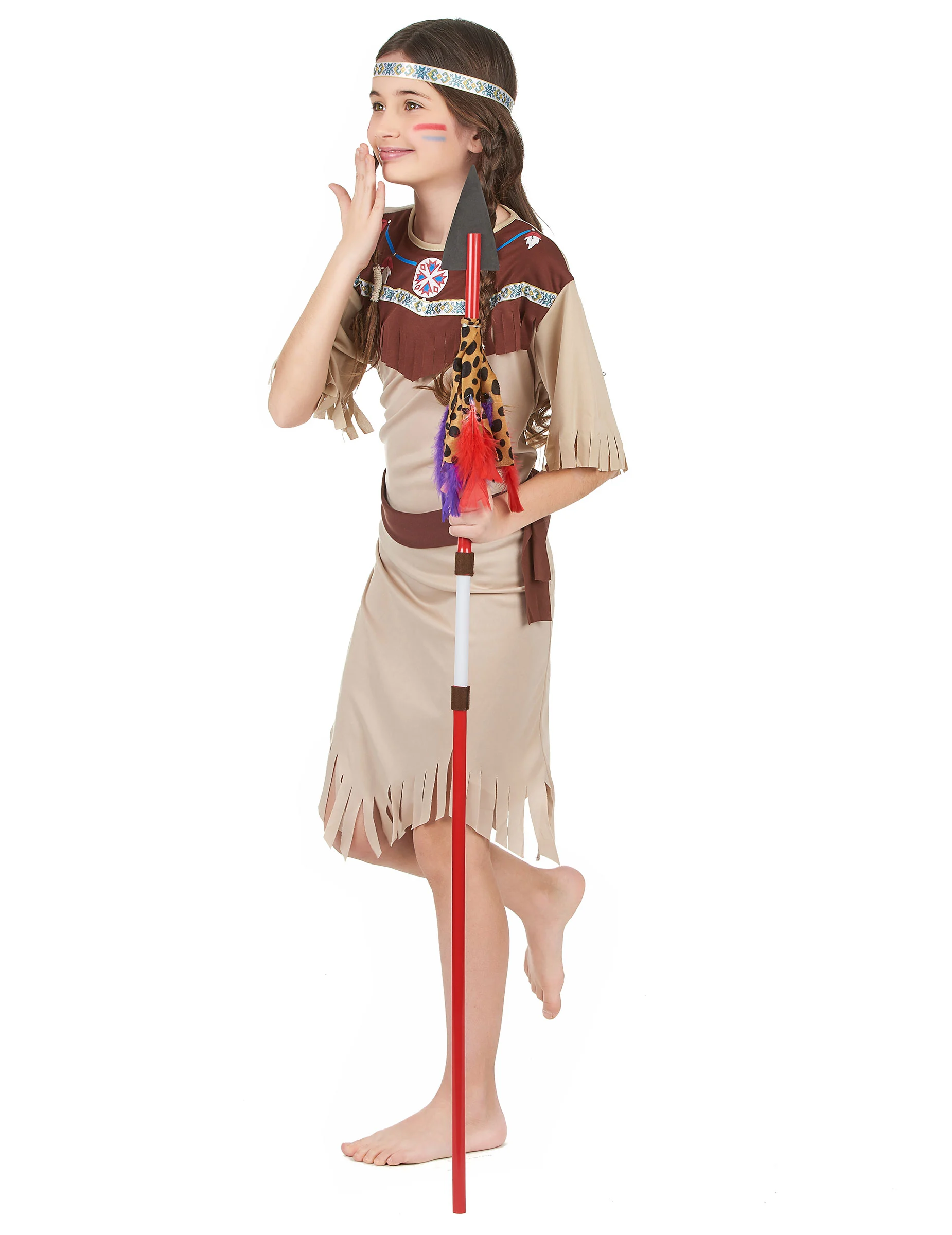 Dit indianen pak voor meisjes bestaat uit een lange lichte rok, een riem met klittenbandsluiting en een dunne haarband met kleurrijke synthetische pluimen. De outfit is licht en comfortabel. (Veren en speer niet inbegrepen) Dit kostuum maakt van u een echte kleine Apache voor een verjaardagsfeest, een voorstelling of een andere verkleedmoment.