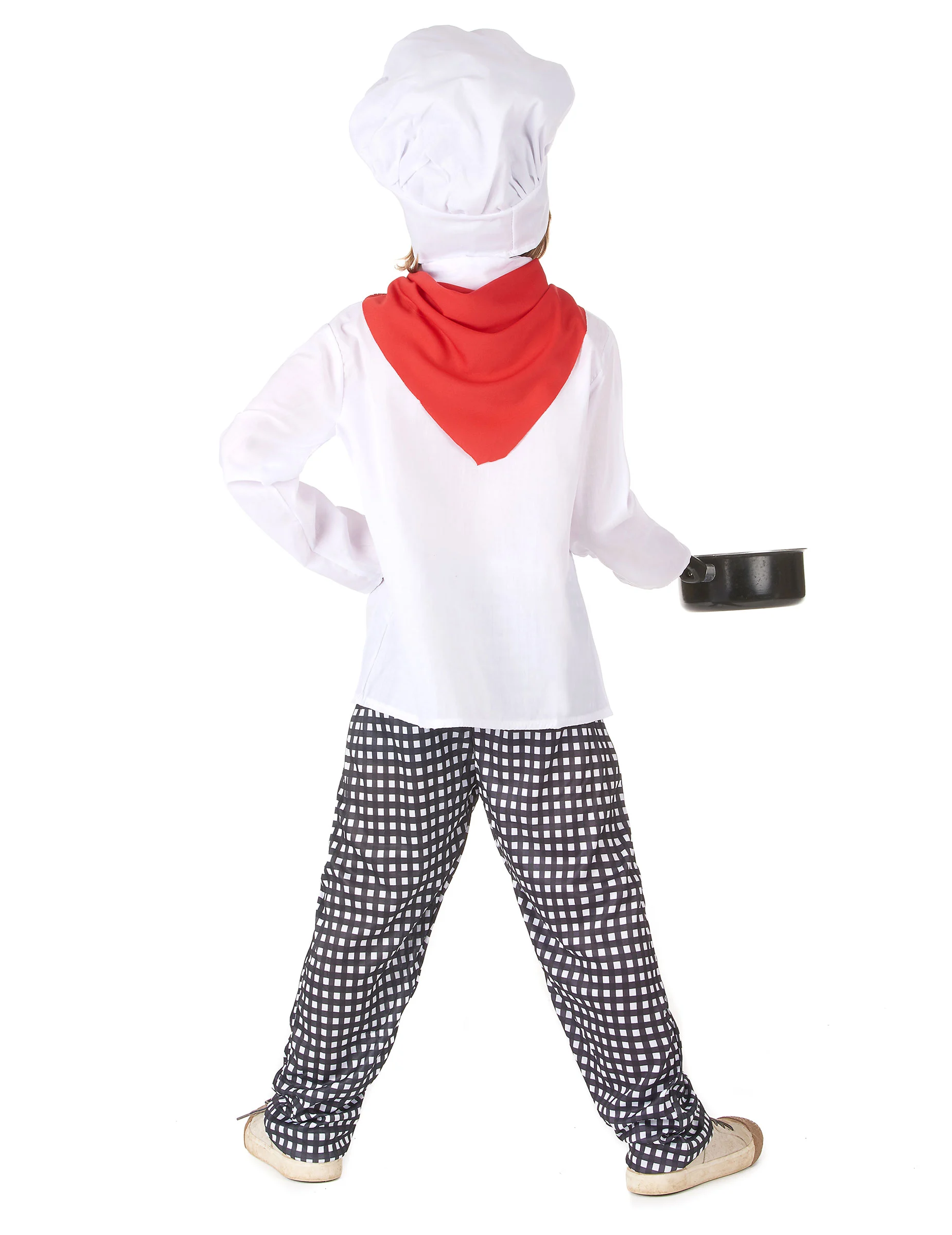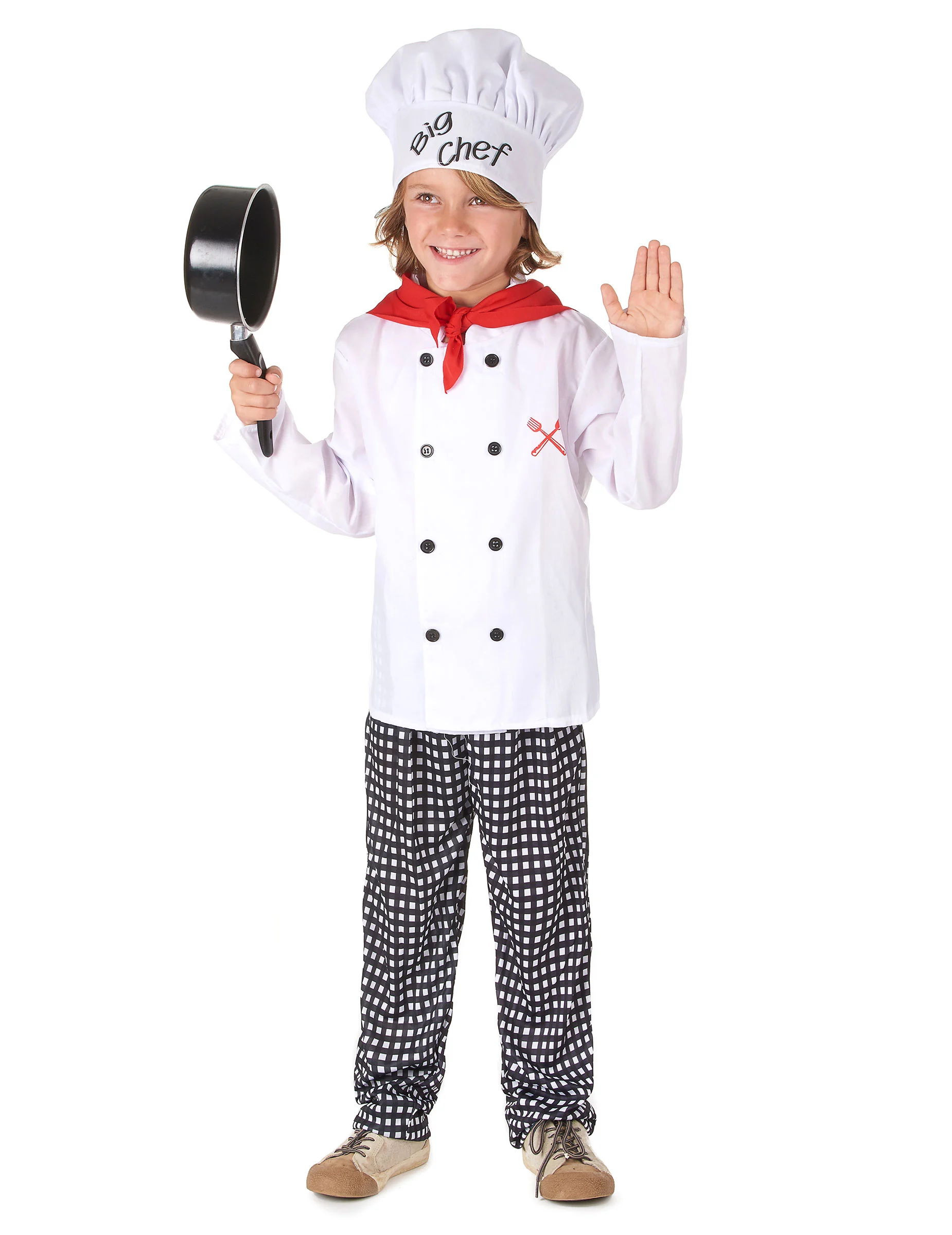 Deze kok outfit voor jongens bevat een jasje, een broek, een sjaaltje en een muts. (Schoenen en koksaccessoires niet inbegrepen).