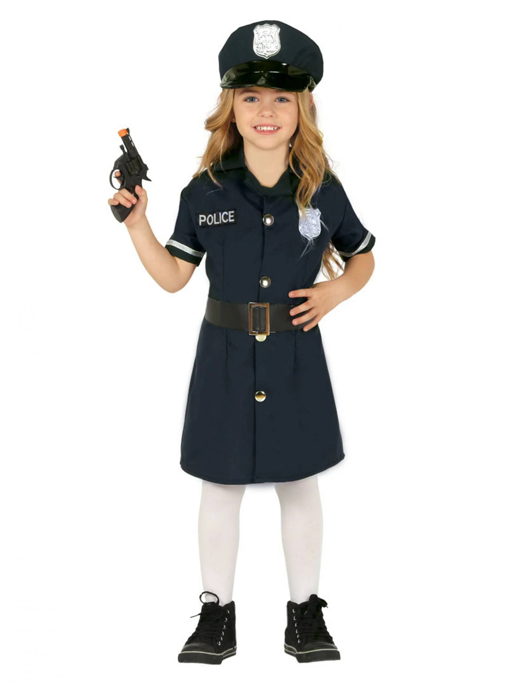 Dit politie pak voor meisjes bestaat uit een jurk, een riem en een pet (pistool, panty en schoenen niet inbegrepen).