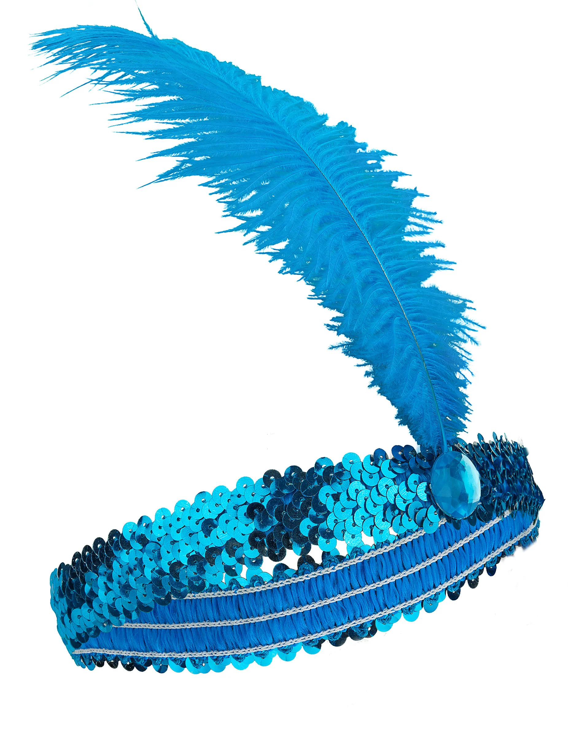 Deze elastische charleston hoofdband is voor vrouwen en is blauw van kleur. De hoofdband is bedekt met lovertjes en een veer met neppe steen is ook aanwezig.