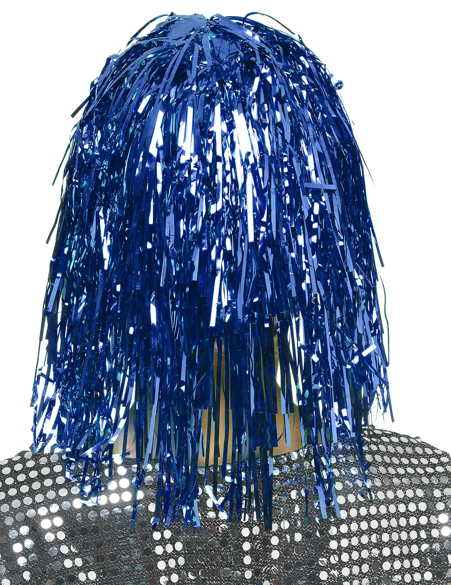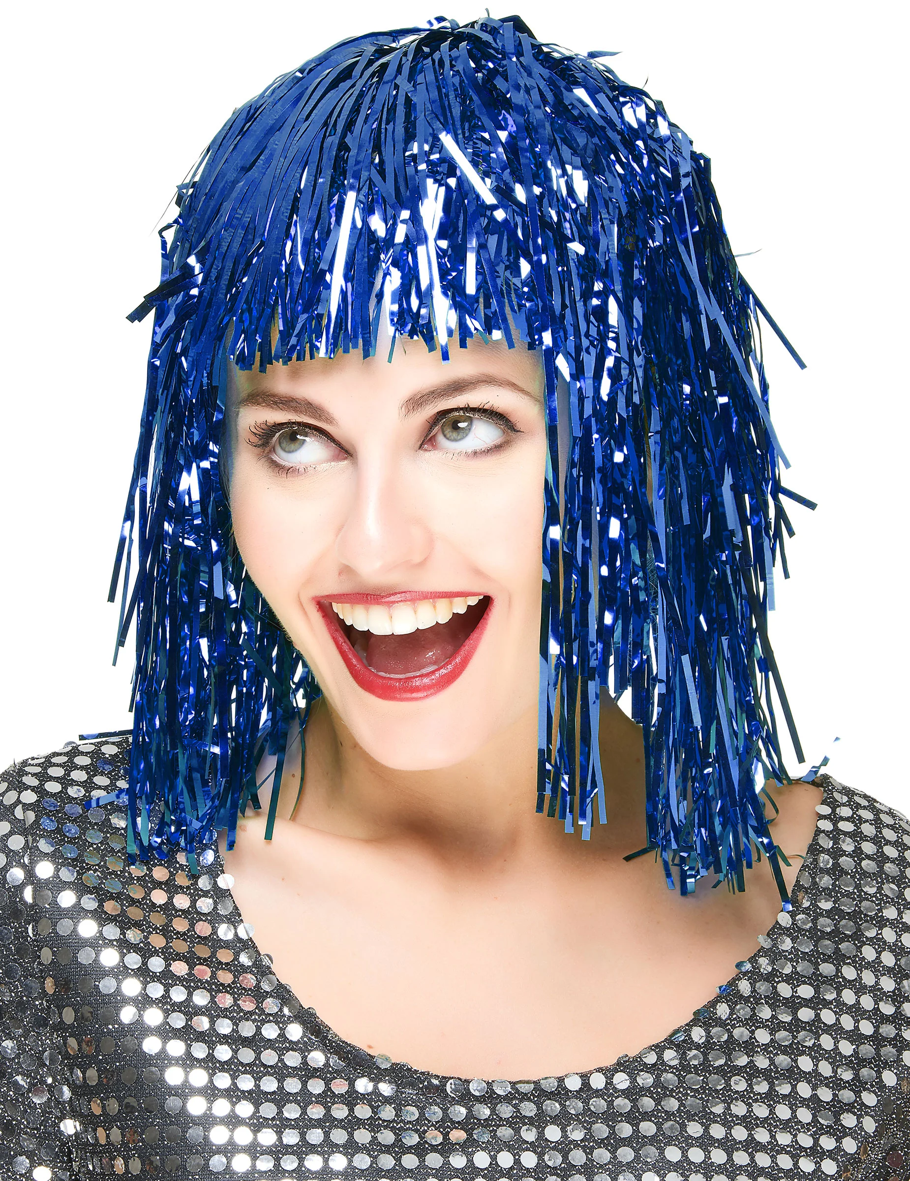 Blauwe glitterpruik voor volwassenen, 25 cm lang, met pony en komt tot op de schouders. Ideaal om een outfit voor een thema-avond met vrienden compleet te maken.