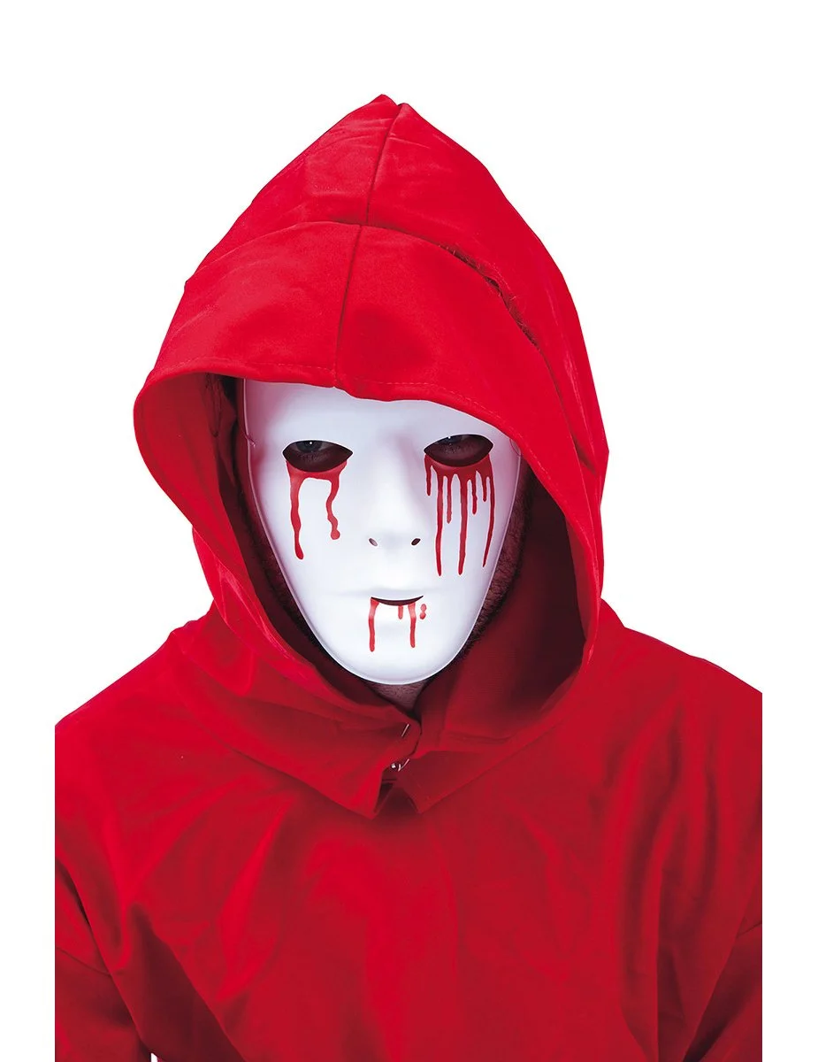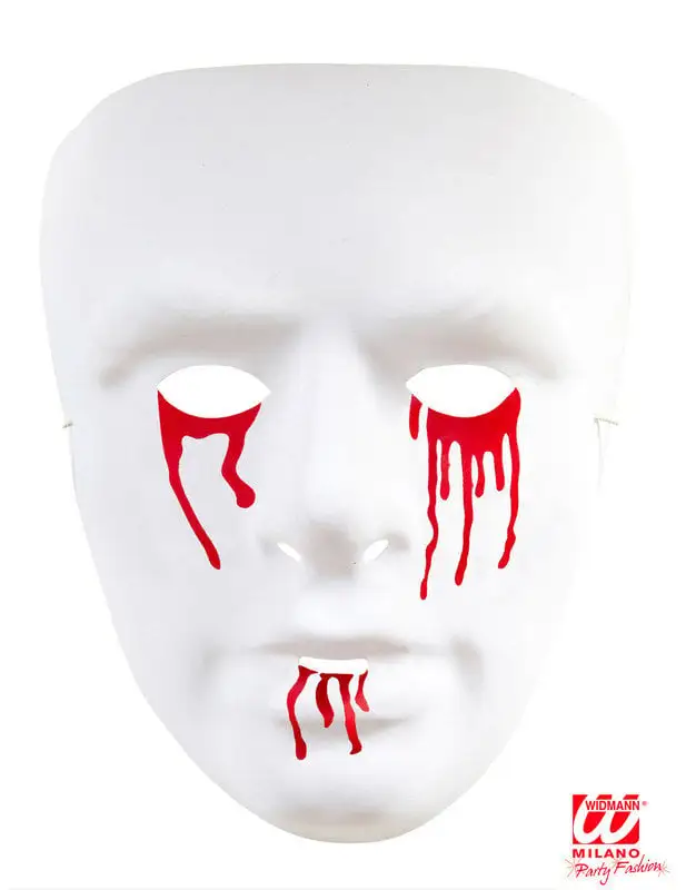 Dit half masker voor volwassenen is gemaakt van soepel plastic. Het is wit en heeft rode bloederige kleuren bij de ogen en de mond. Openingen zijn aanwezig bij de ogen, neus en mond.
