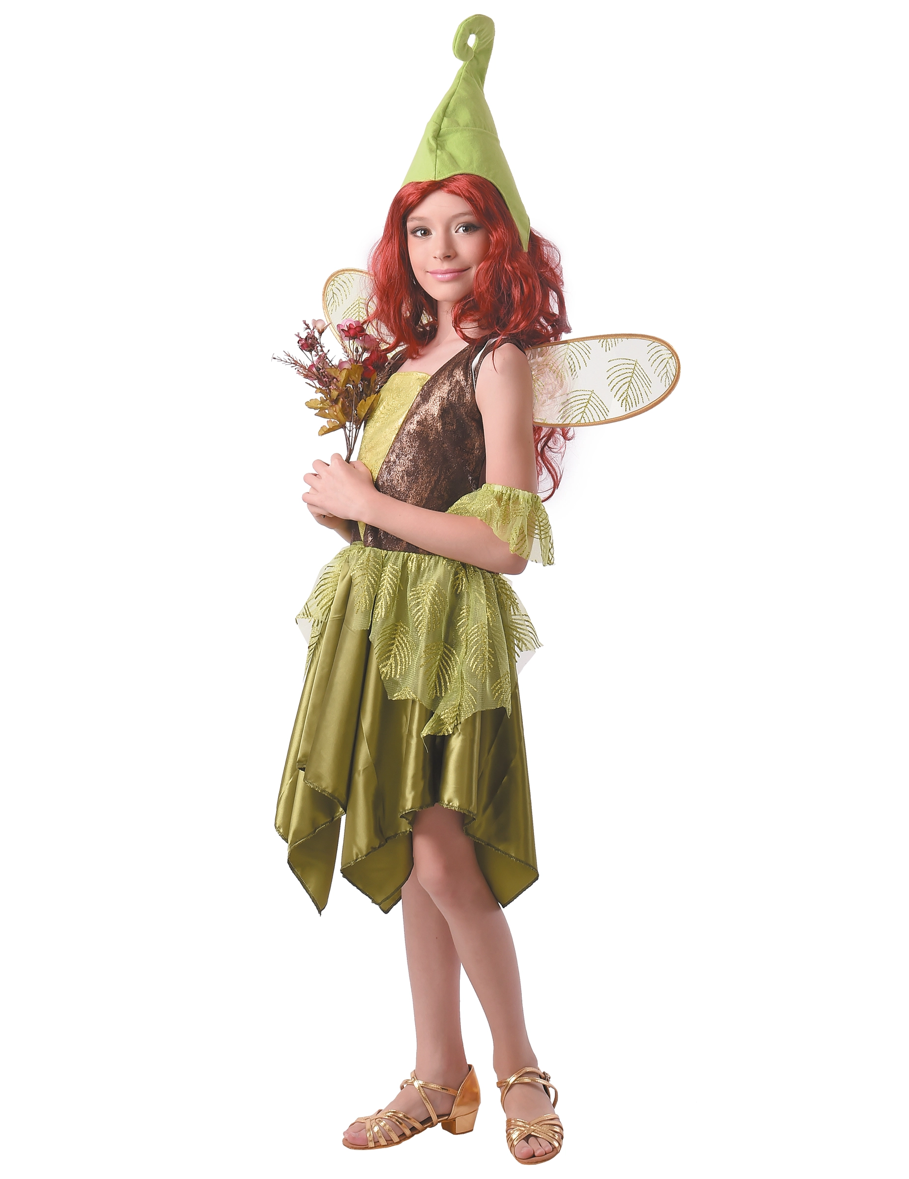 Deze bosfee vermomming is voor meisjes. Het bestaat uit een hoed, een jurk, een paar vleugels en manchetten.