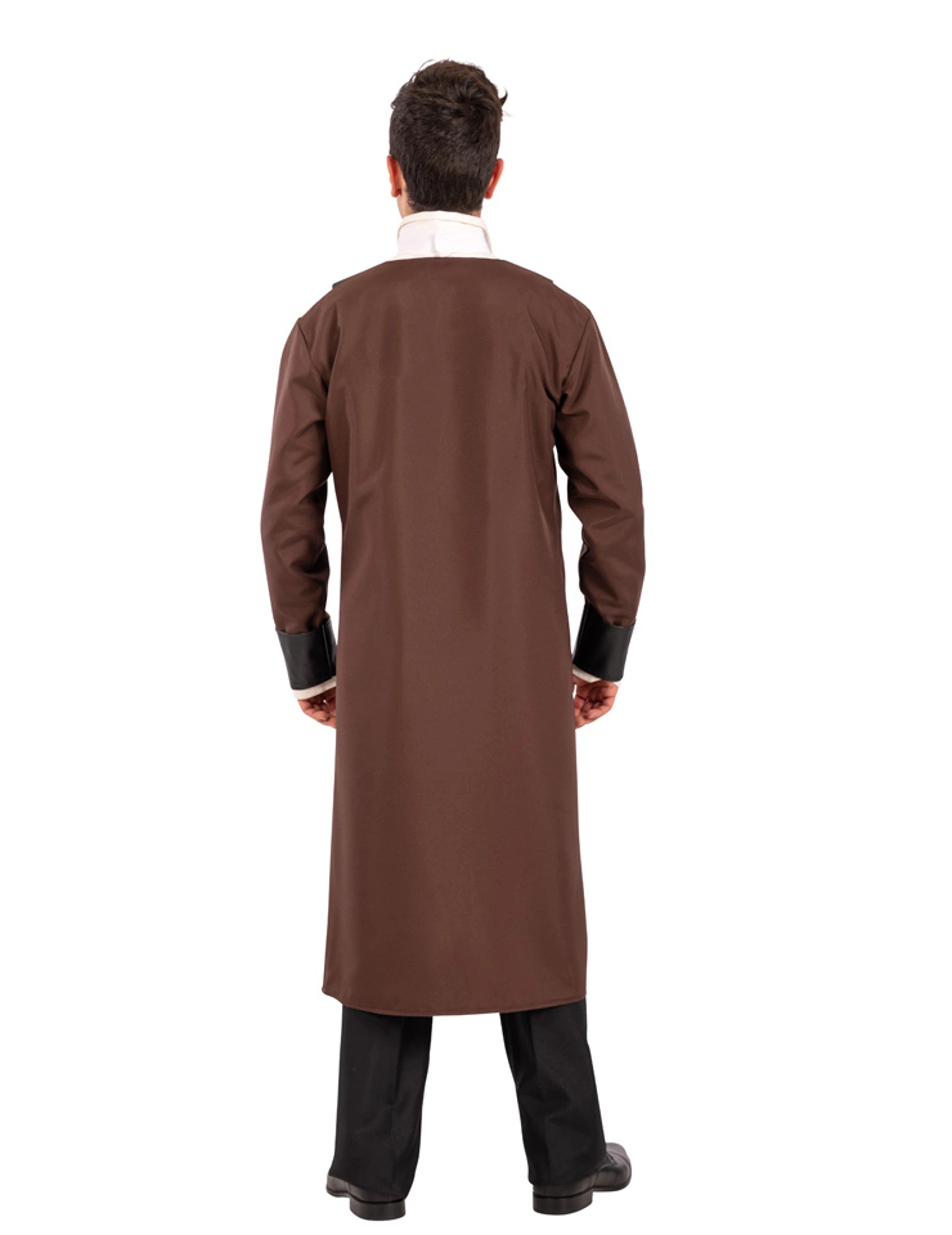 De jas van stof is bruin en heeft een opdruk van goudkleurige tandwielen aan de onderkant. Het heeft goudkleurige knopen en zomen van nep leer.