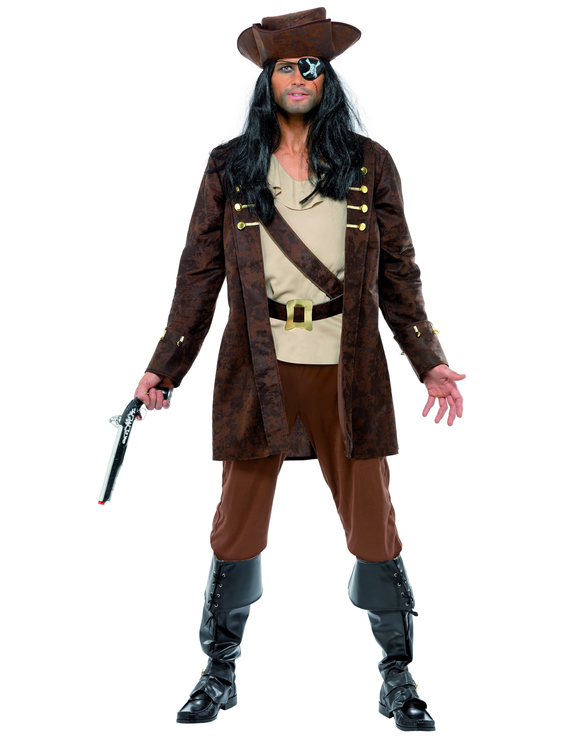 Dit piratenkostuum voor mannen bestaat uit een prachtige halflange vest met goudkleurige versieringen en knopen en een T-shirt met riem. De broek met elastische taille is een kniebroek in dunne stof. De hoed in soepele stof past zich goed aan de vorm van het hoofd aan. (Pruik, pistool en laarzen niet inbegrepen) Dit kostuum is perfect voor carnaval en een piratenfeestje.