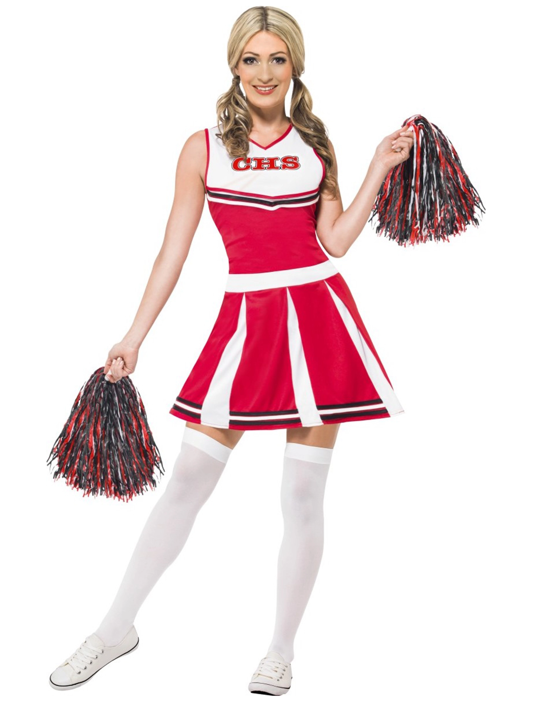 Dit cheerleader kostuum voor dames bestaat uit een jurk en 2 pompons (Schoenen niet inbegrepen).