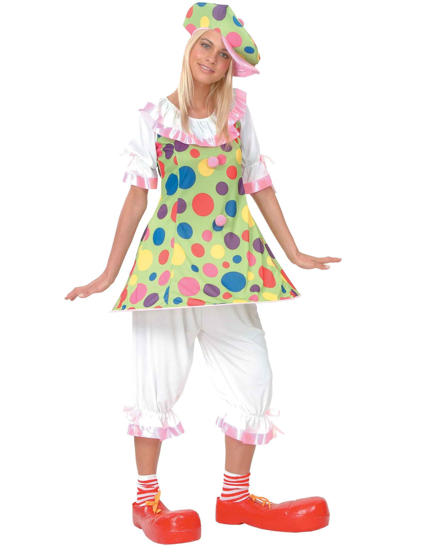 Dit clown pak voor dames bestaat uit een jurk met een hoepel, een driekwart broek en een hoed. De groene jurk heeft grote kleurrijke bollen, de hoed past bij de jurk en heeft een roze klep. De pofbroek is wit met roze satijnen afwerkingen, zoals op het bovenstuk en de mouwen van de jurk (pruik, kousen en schoenen niet inbegrepen). Dit clown kostuum is ideaal voor een verkleedfeestje, voor een verjaardag, een voorstelling of carnaval.