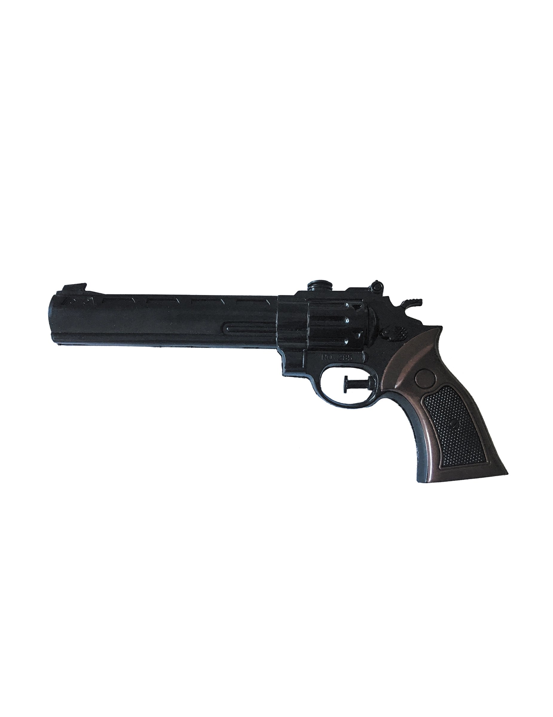 Dit cowboy pistool is gemaakt van plastic en is een waterpistool. De loop is zwart en het handvat is bruin. Het is ongeveer 27 cm lang en is geschikt voor zowel volwassenen als kinderen.