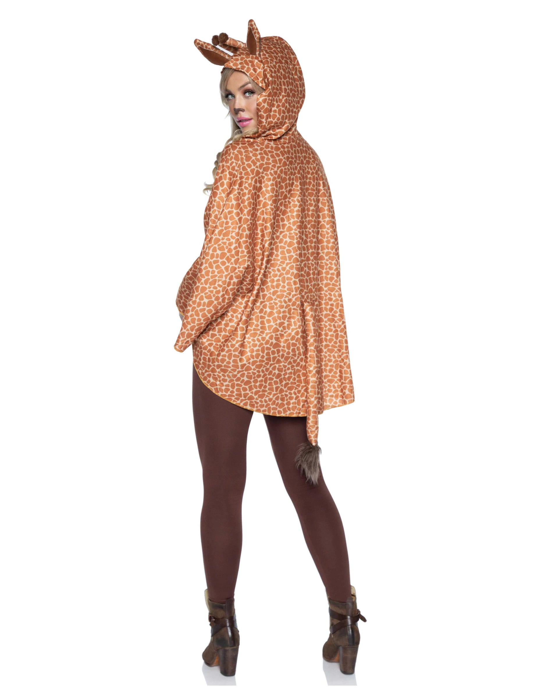 Het heeft patronen die de vacht van de giraffe voorstellen. Aan de achterkant van de cape zijn een staart en een capuchon genaaid. De capuchon heeft twee oren en twee kleine hoorns.