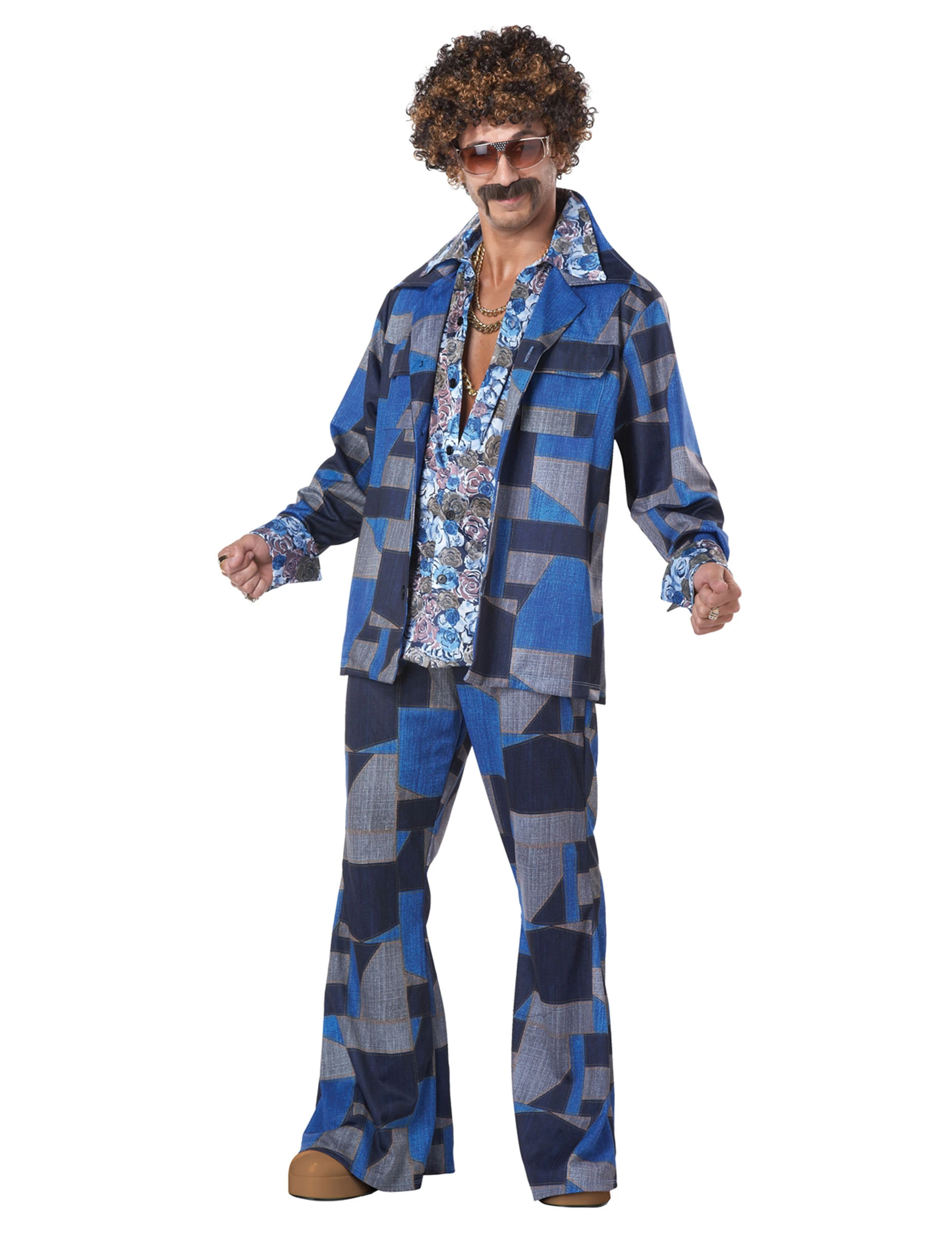 Dit foute disco kostuum voor mannen bestaat uit een shirt, een jas, broek en nep snor (kettingen, zonnebril en schoenen niet inbegrepen).