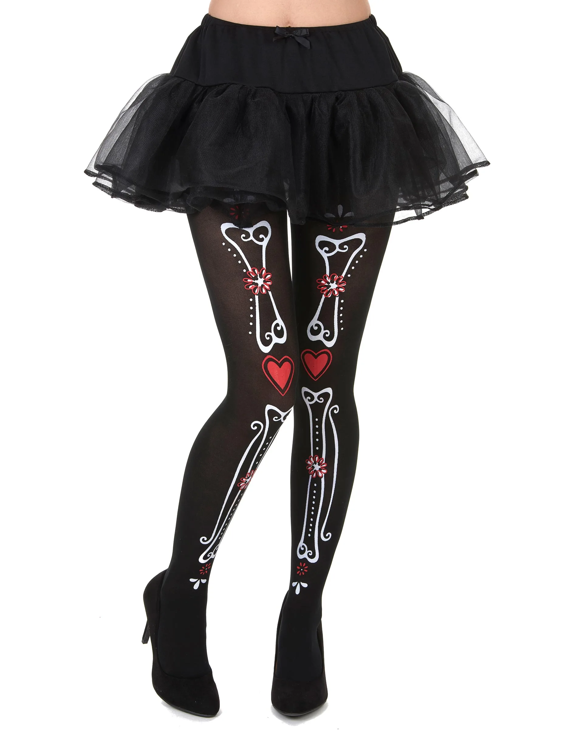 Deze prachtige nylon kousen zijn zwart en bedrukt met bot patronnen en rode hartjes.