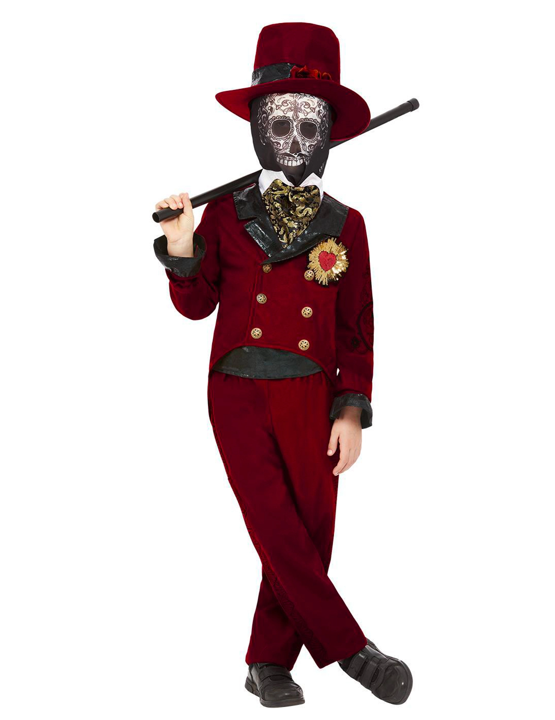 Dit rode Dia de los muertos bruidegom kostuum bestaat uit een jas met shirt, broek, masker en hoed (schoenen en wandelstok niet inbegrepen).