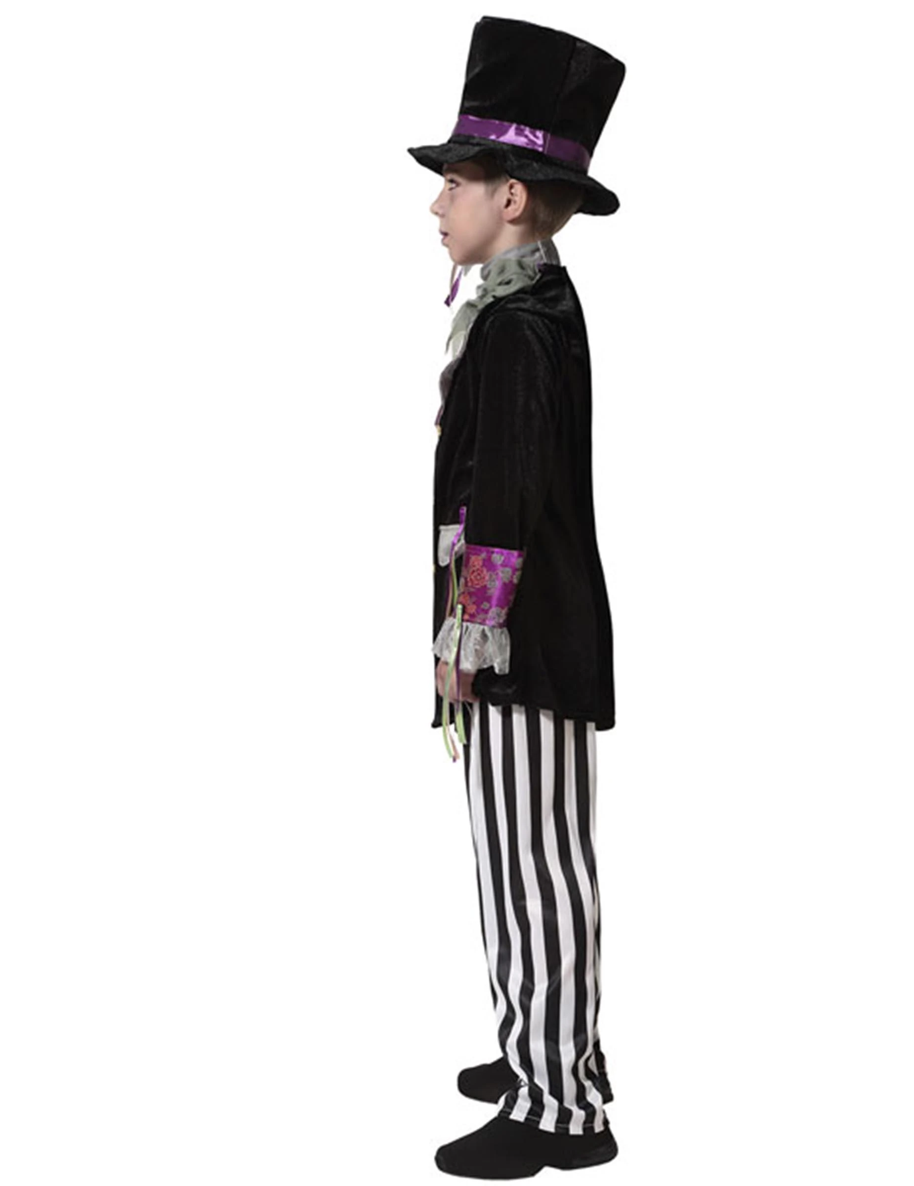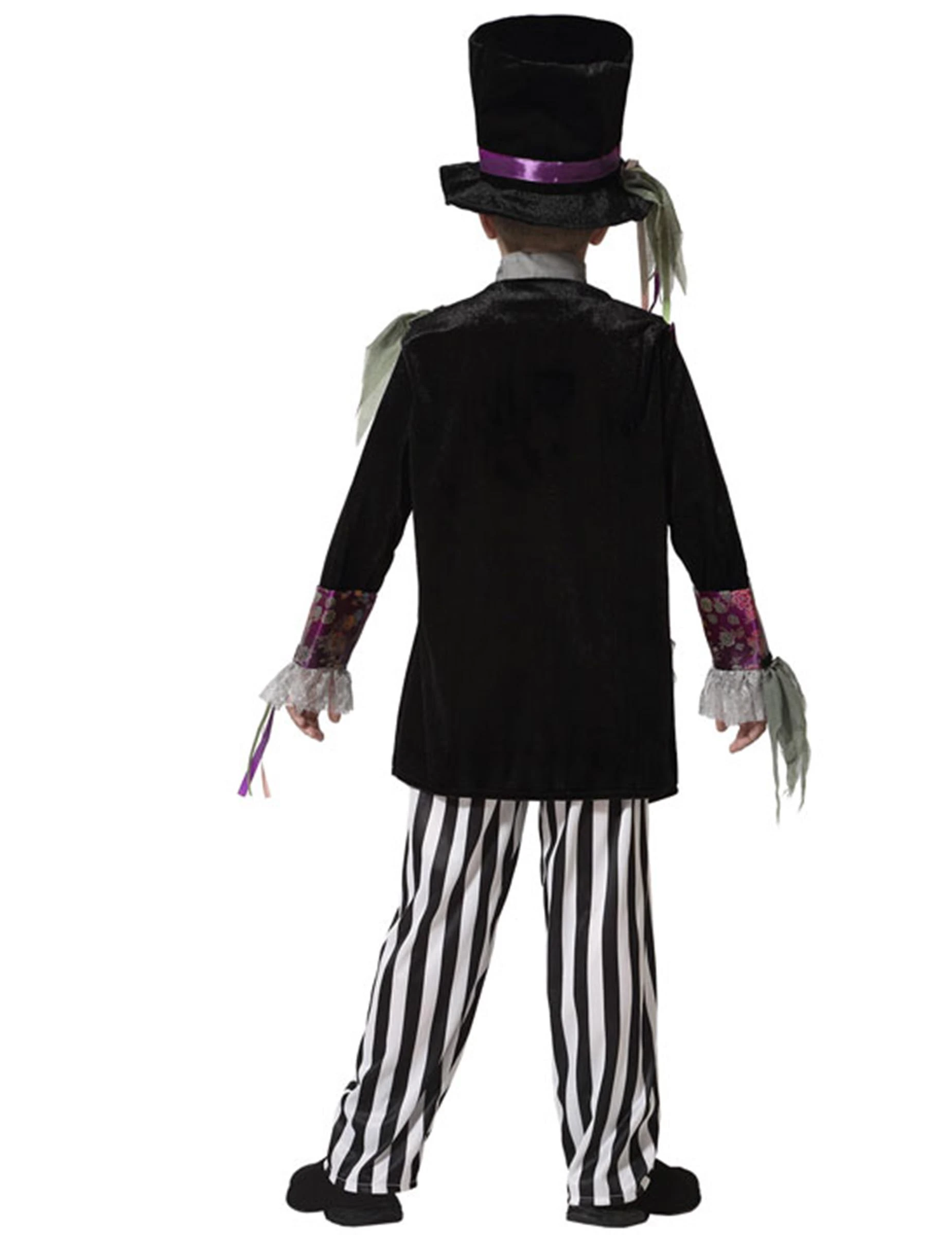 Dit donkere hoedenmaker kostuum voor kinderen bestaat uit een jas, kraag, broek en hoed (kop en schoenen niet inbegrepen). Het jasje van de hoedenmaker is zwart, met paarse revers. Het heeft grijze nepzakken en is versierd met grijs/groene stoffen stroken.