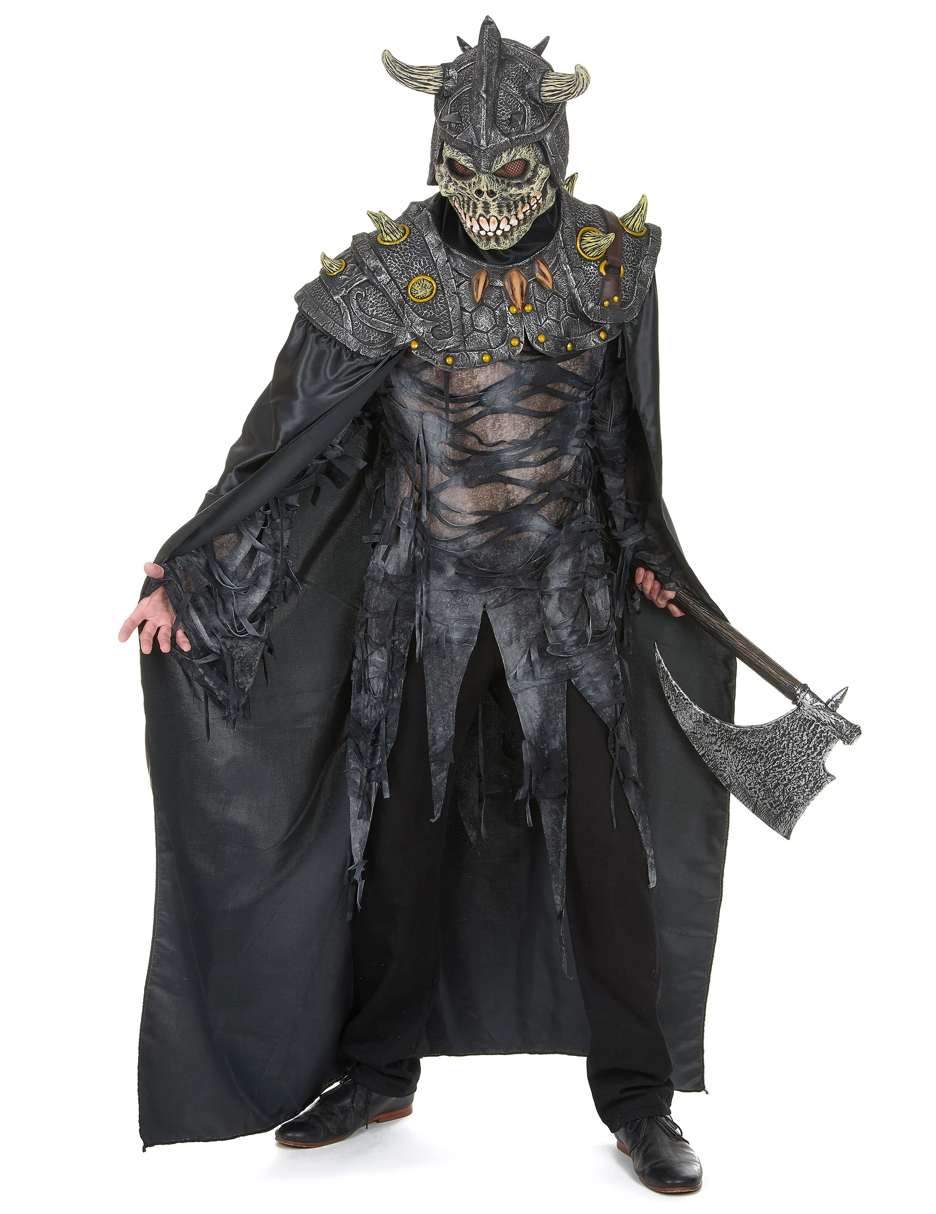 Dit duistere leger ridderkostuum voor volwassenen bestaat uit een cape waaraan een masker is bevestigd. (Bijl, trui, broek en schoenen niet inbegrepen.) De cape is lang en zwart en is gemaakt van satijnachtig stof. De schouders zijn bedekt met een harnas van soepel latex dat lijkt op metaal, versierd met hoorns en nagels.