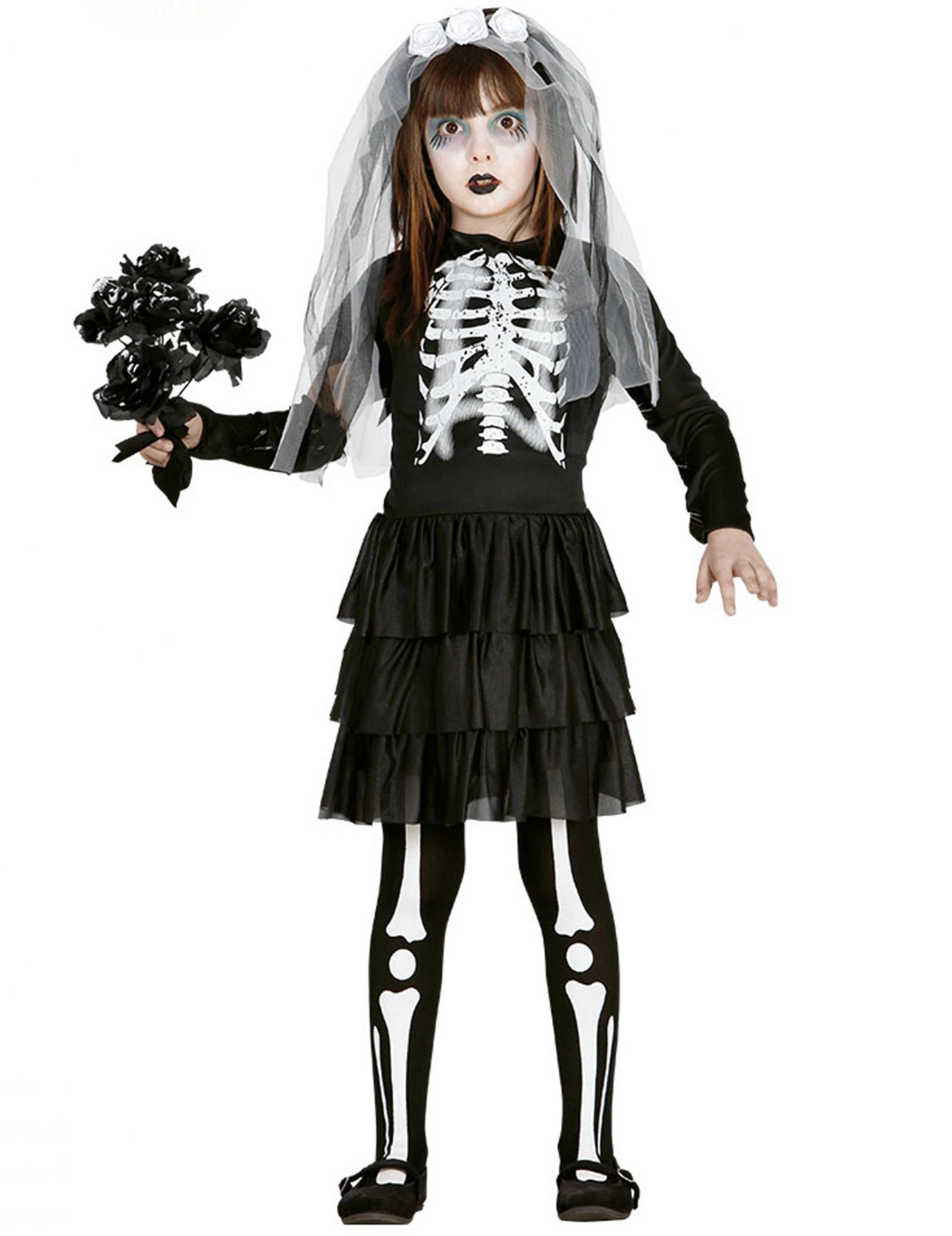 Dit skelet bruid kostuum voor meisjes bestaat uit een jurk, een panty en een haarband (boeket, schoenen en schmink niet inbegrepen).