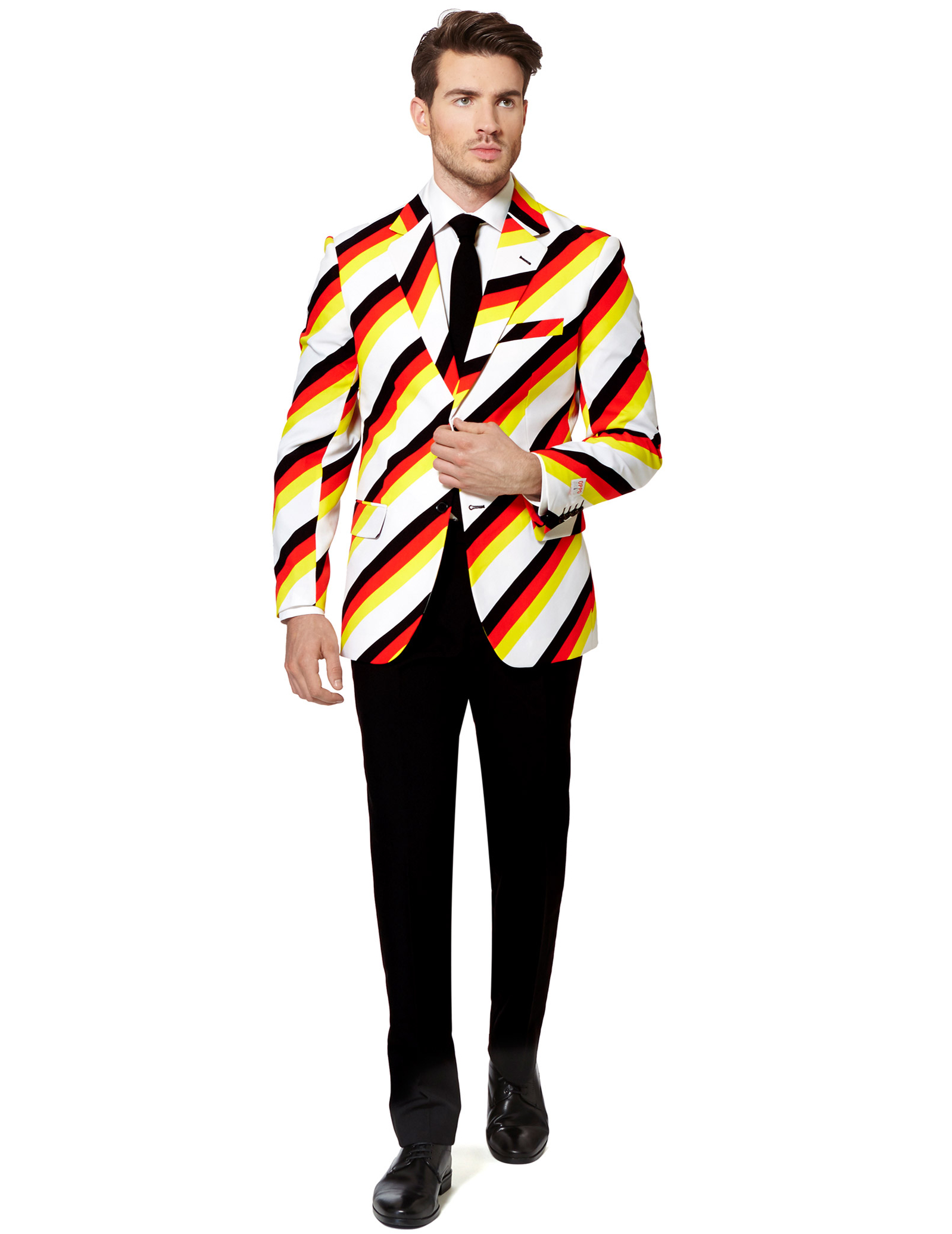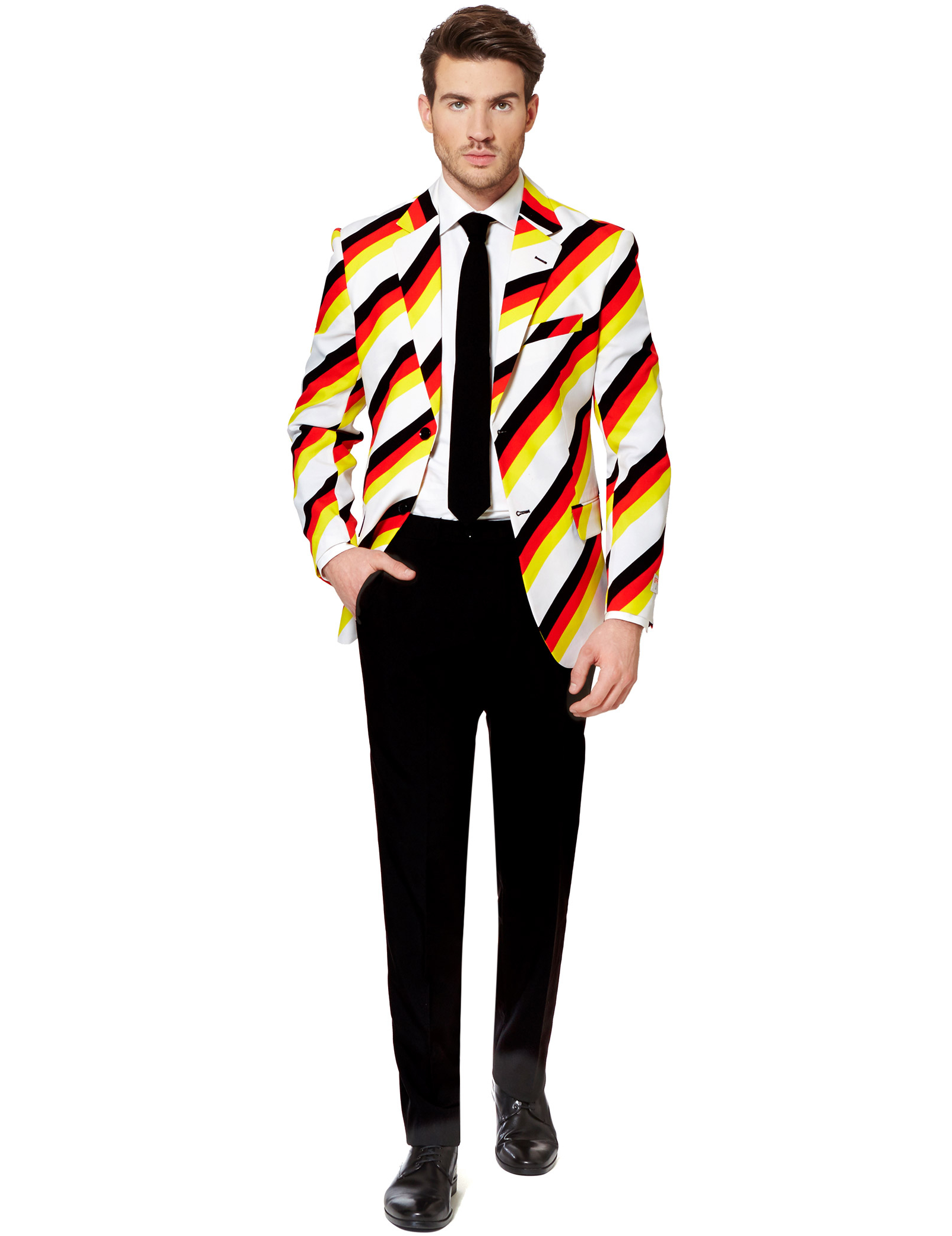 Dit kostuum van het merk Opposuits™ bestaat uit een colbert, een broek en een stropdas. (Blouse en schoenen niet inbegrepen.) Het is perfect getailleerd en is volledig wit, versierd met rode, gele en zwarte strepen als de Duitse vlag. De discrete schoudervullingen zorgen voor een chique postuur en met een zwarte knoop kan het aan de voorkant gesloten worden. Het heeft twee neppe zakken aan de zijkant en een kleine zak op borsthoogte.