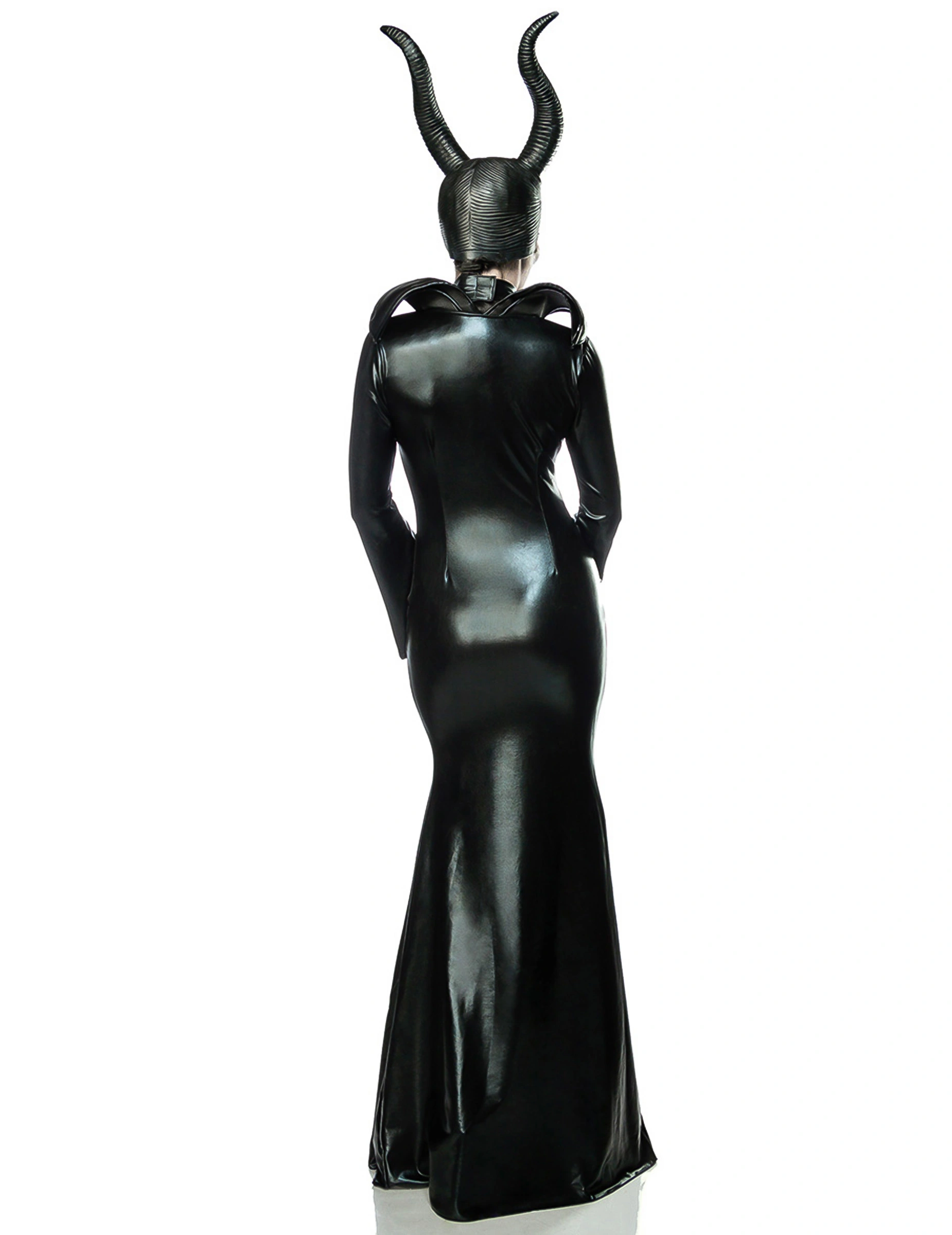 De muts is zwart met twee grote hoorns, en maakt het kostuum compleet.