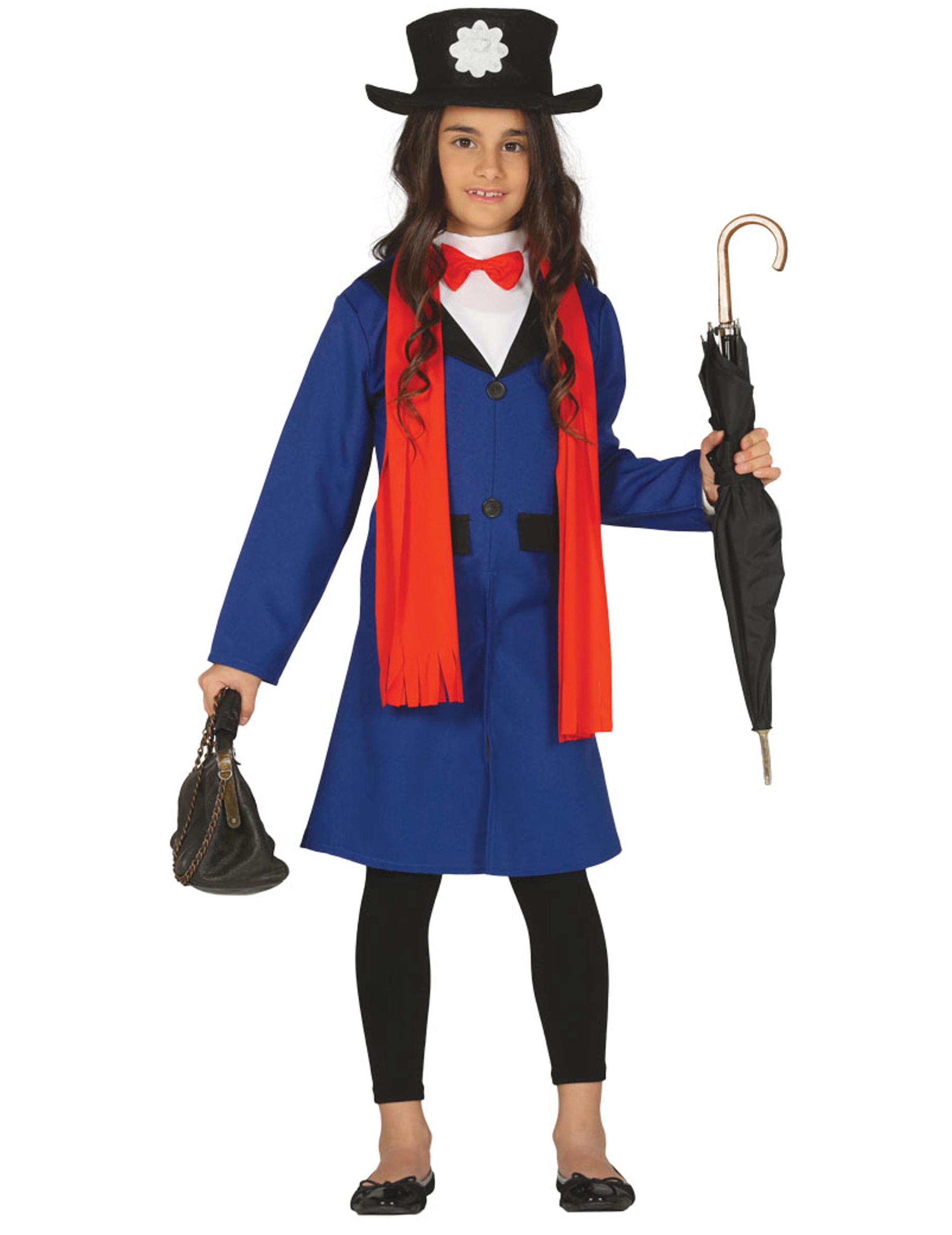 Dit Engelse oppas kostuum voor meisjes bestaat uit een jas, een sjaal en een hoed (tas, paraplu, broek en schoenen niet inbegrepen).
