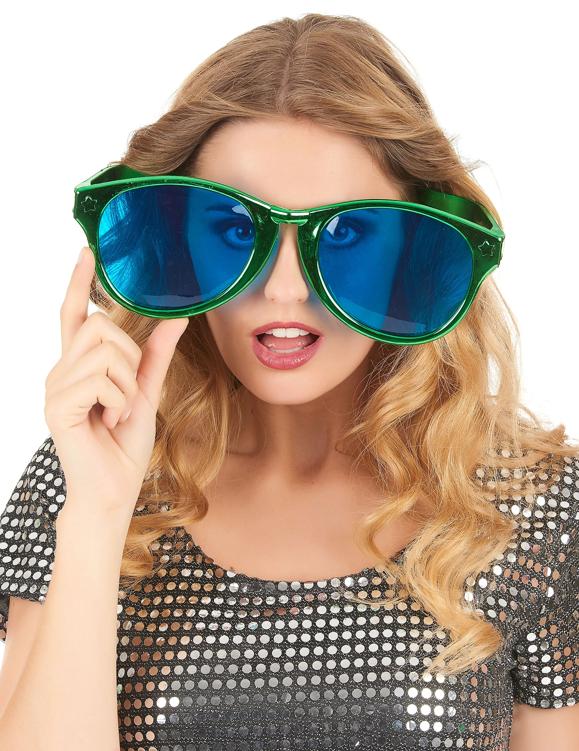 Deze enorme bril voor volwassenen zijn groen met lichtblauwe glazen.