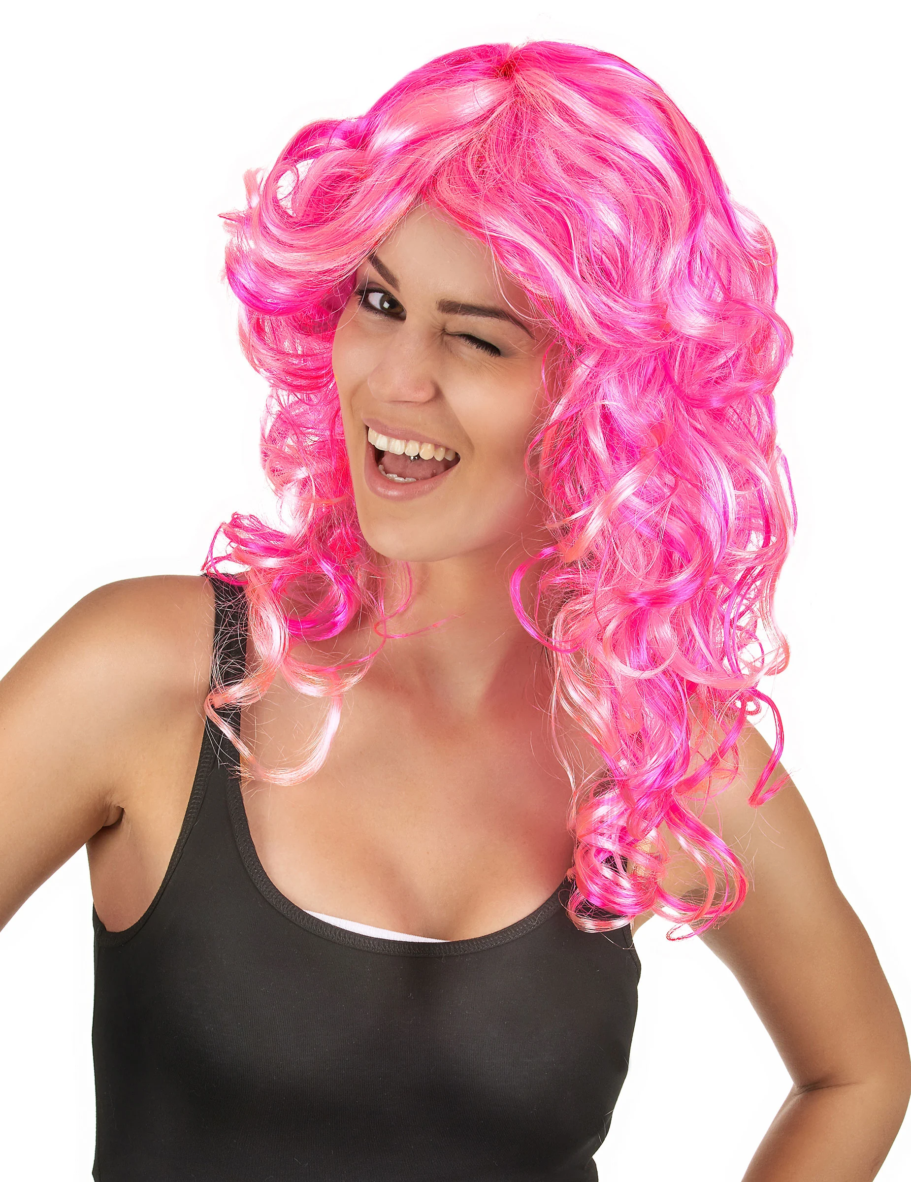 Deze roze pruik voor vrouwen is gemaakt van roze synthetische haren. De pruik heeft gekrulde haren en is half lang.