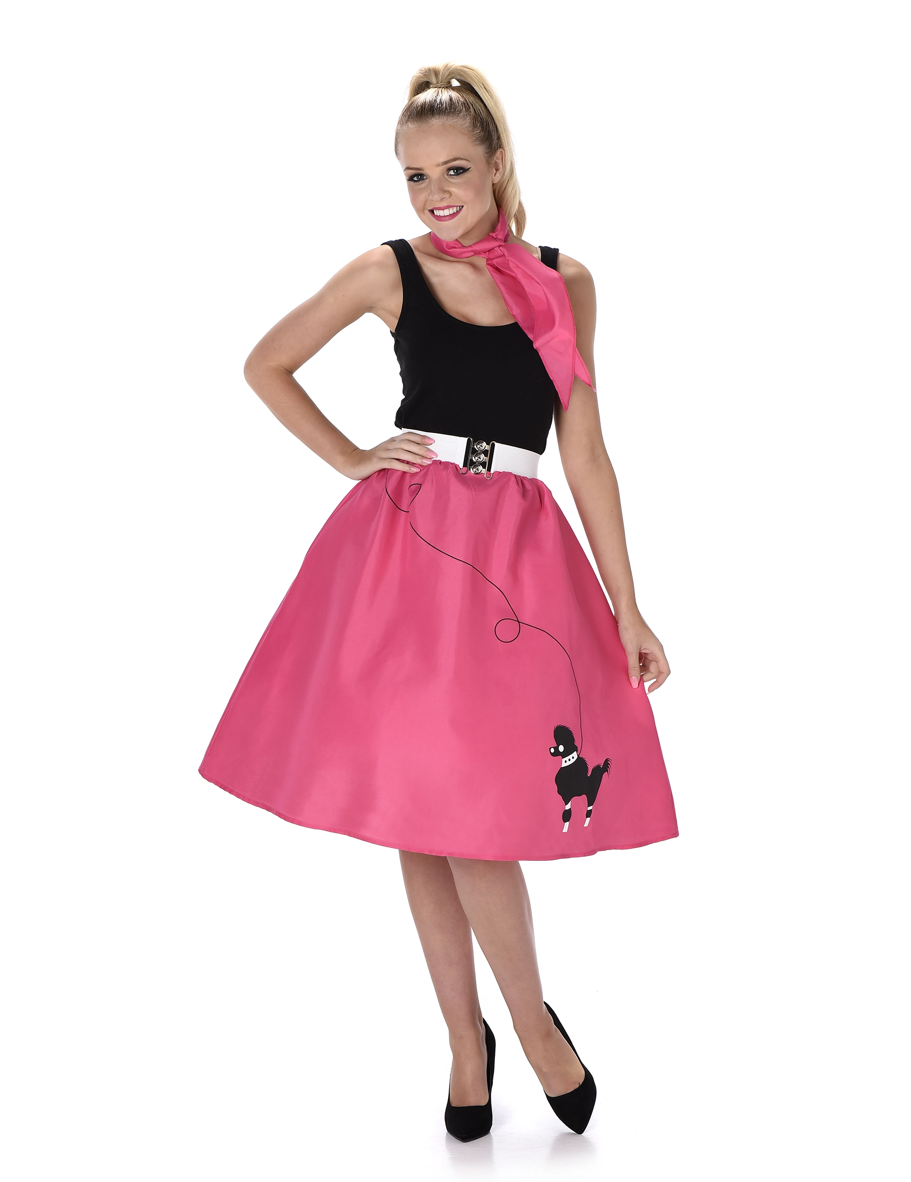 Deze jaren 50 outfit voor vrouwen bestaat uit een rok, een riem en een sjaaltje. (Topje en schoenen zijn niet inbegrepen).
