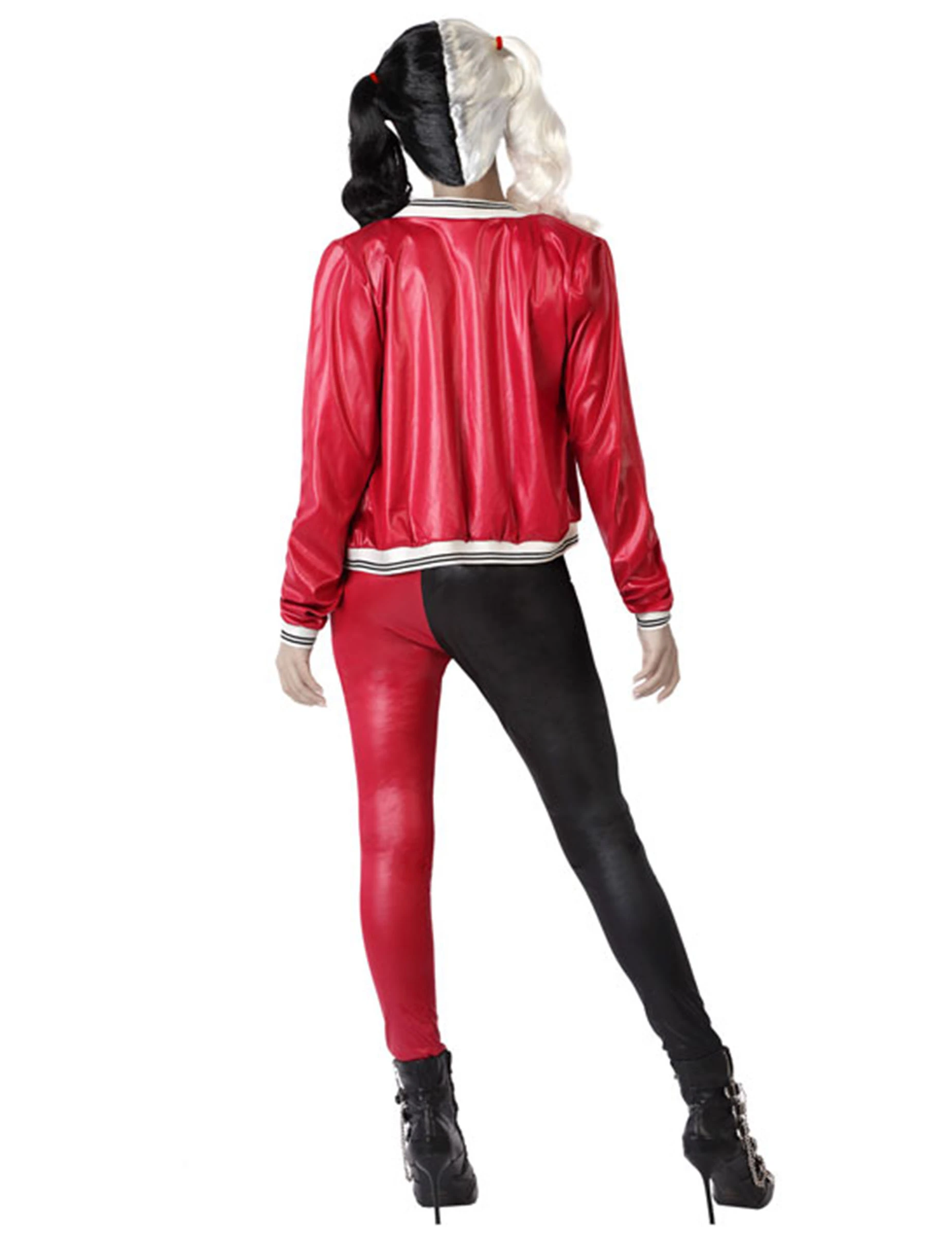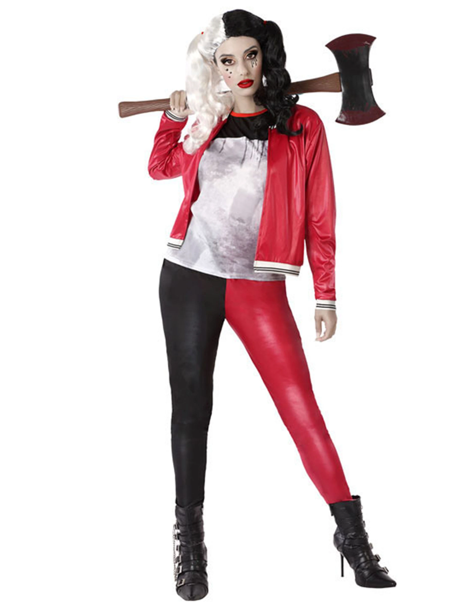 Dit gekke huurmoordenaar kostuum voor vrouwen bestaat uit een jas, t-shirt en broek (pruik, bijl en schoenen niet inbegrepen). Het t-shirt is grijs en zwart, met een vervaagd effect. De halslijn is afgebiesd met een rode vlecht.