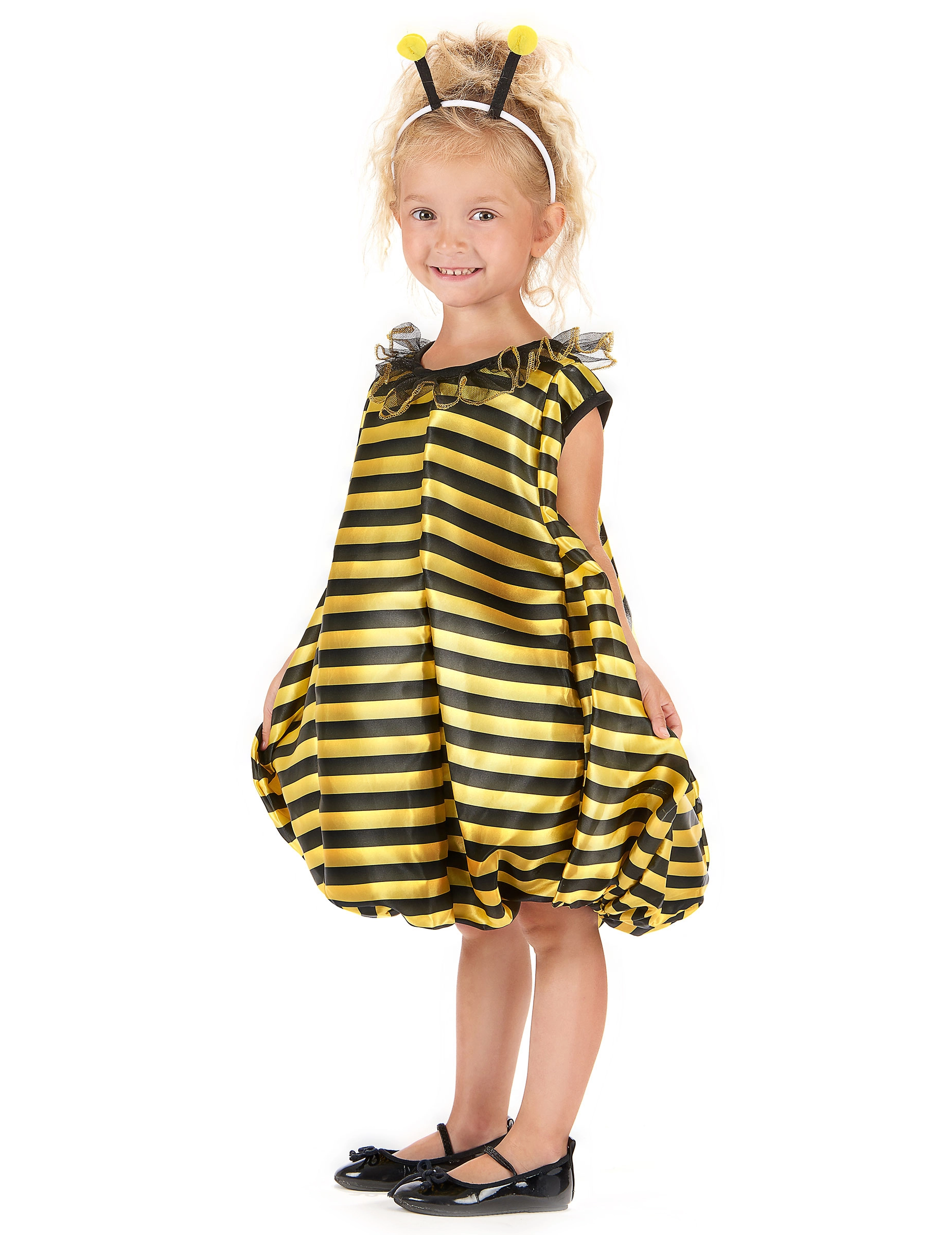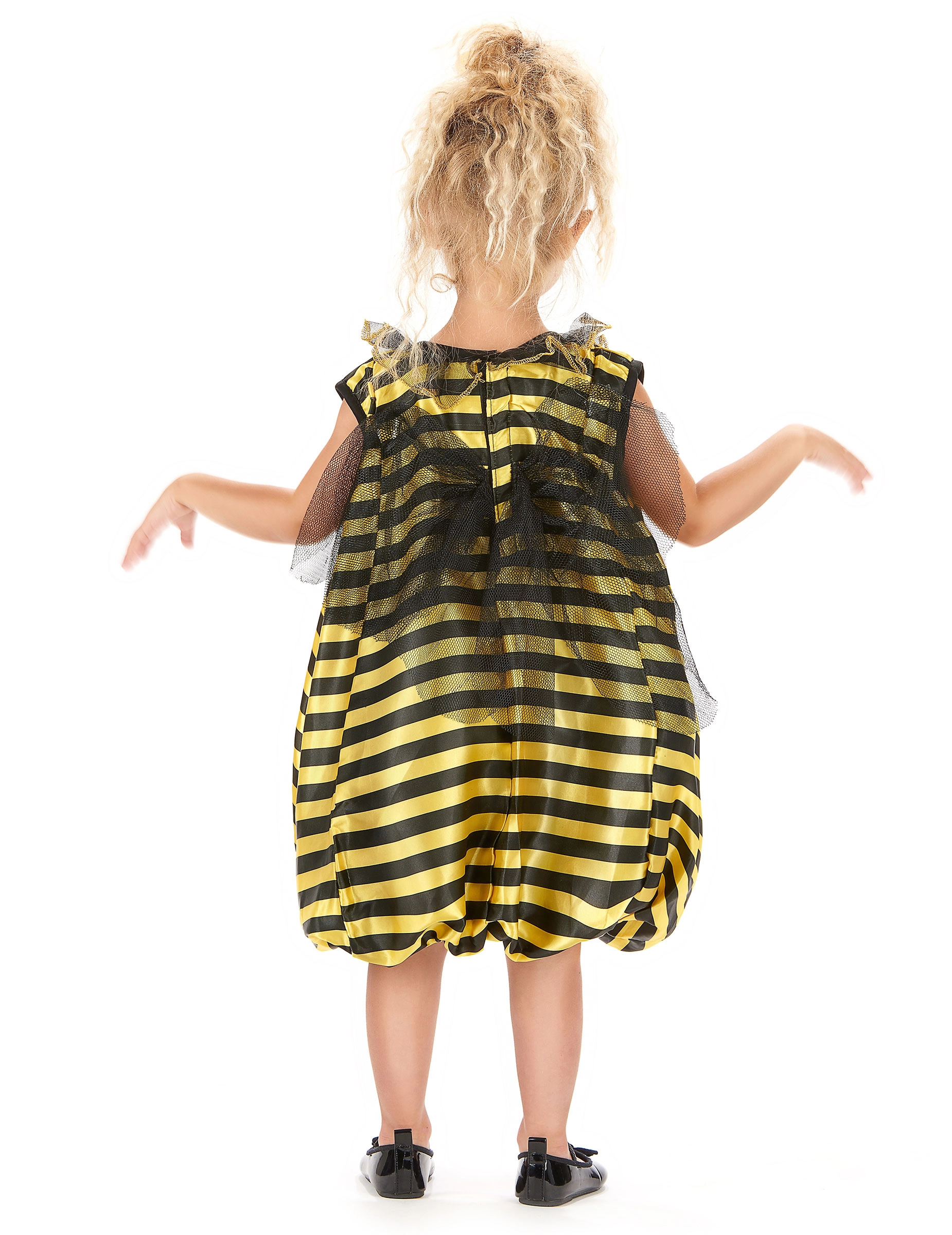 Bijenpak voor meisjes dat bestaat uit een jurk en een haarband. De mouwloze jurk met elastische onderkant voor een gebombeerd effect is voorzien van 2 vleugels in voile die op de rug bevestigd worden met kleine velcro’s. De haarband is voorzien van 2 kleine voelsprieten. (T-shirt, panty en schoenen niet inbegrepen). Dit kostuum is perfect om gestalte te geven aan een klein bijtje voor carnaval of op een verkleedfeestje.
