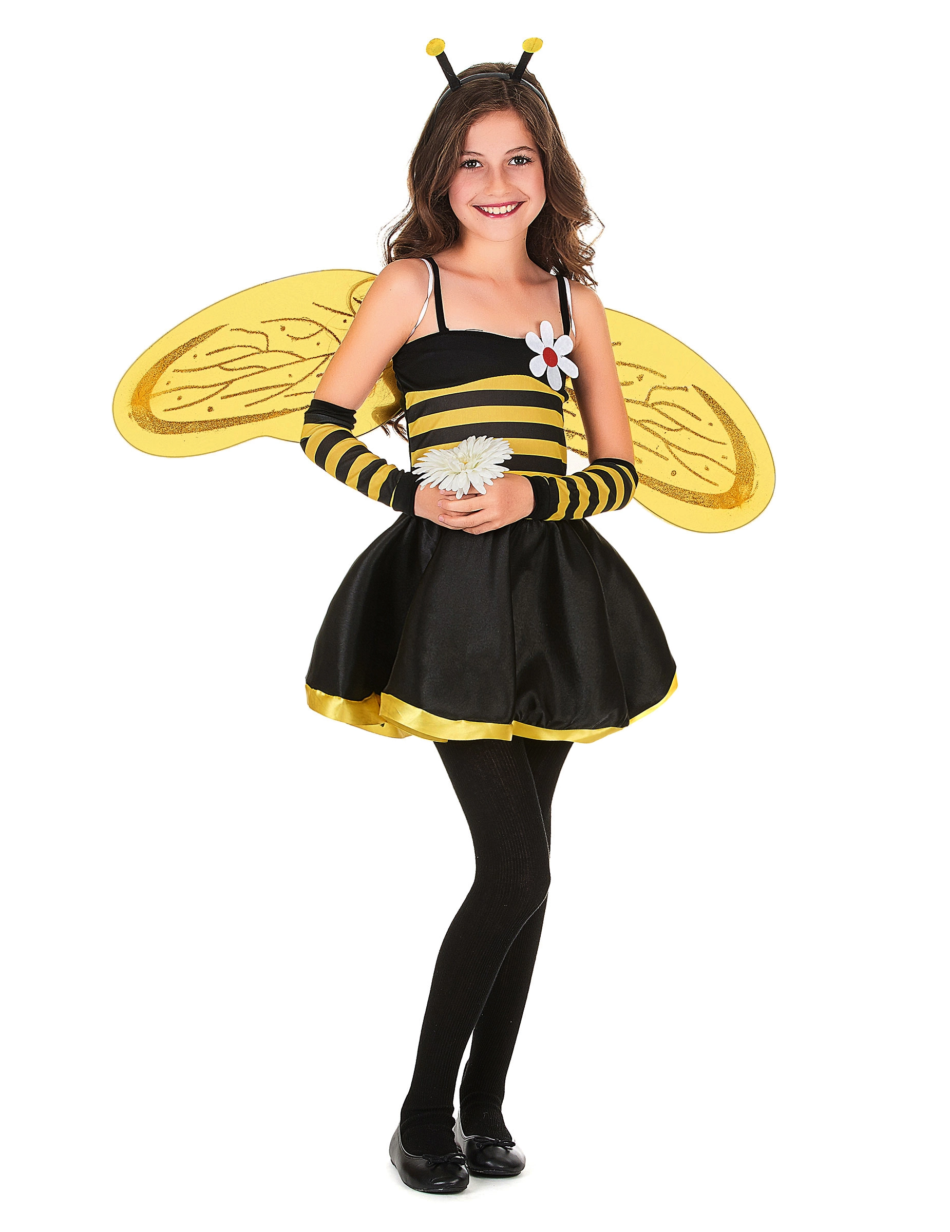 Dit bijenpak voor meisjes bestaat uit een jurk met bretellen met een onderrok in tule en stof met satijneffect, een paar vleugels met doorzichtige elastieken om te dragen als rugzak, een paar bijpassende mouwen (schoenen, bloem en panty niet inbegrepen). Een haarband met twee voelsprieten maken dit pak echt af waardoor uw kind het mooiste bijtje van carnaval of het verkleedfeest zal zijn.