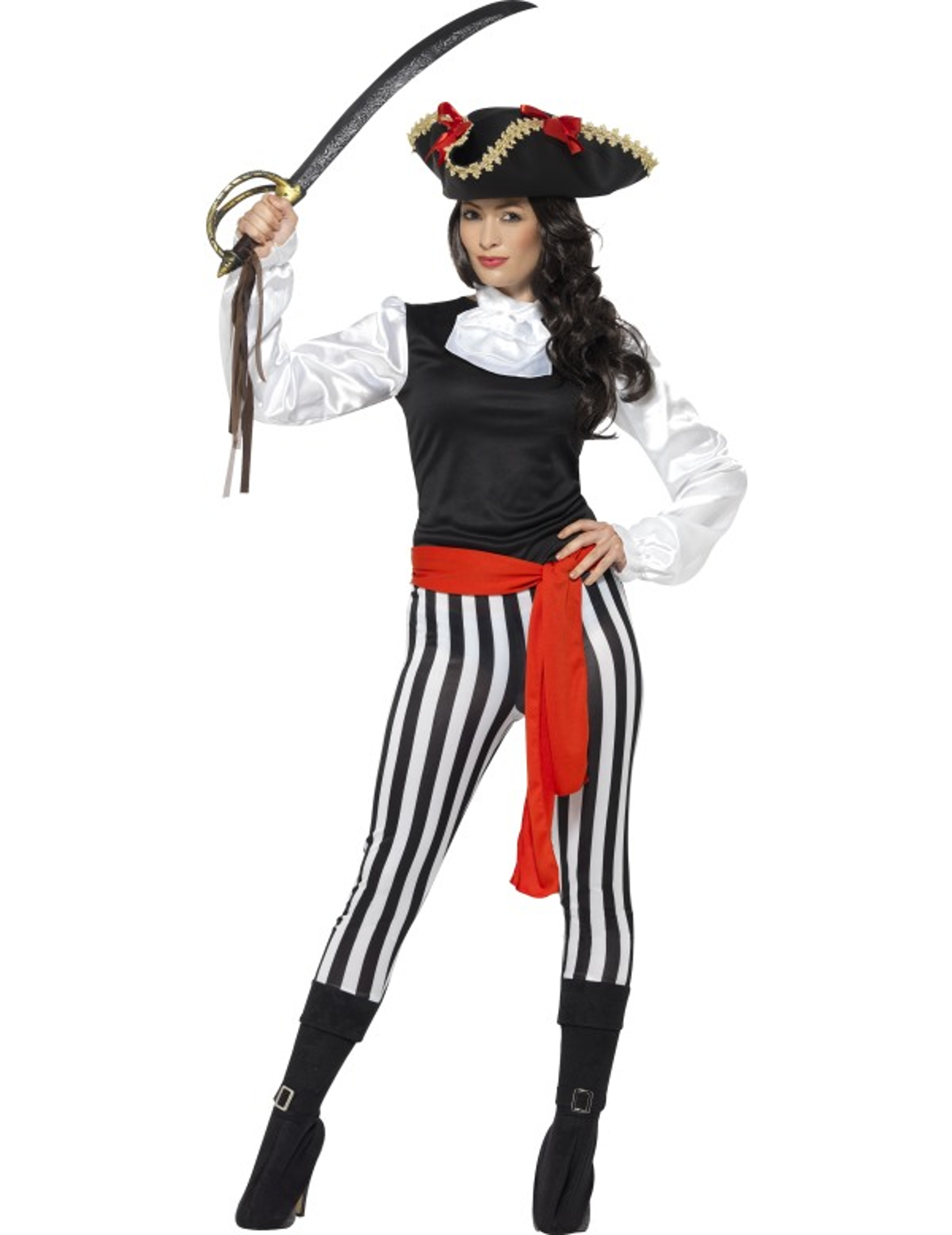 Dit kostuum voor vrouwen bestaat uit een bovenstuk, een broek, een kraag, een riem en overlaarzen. (Hoed en zwaard niet inbegrepen.)