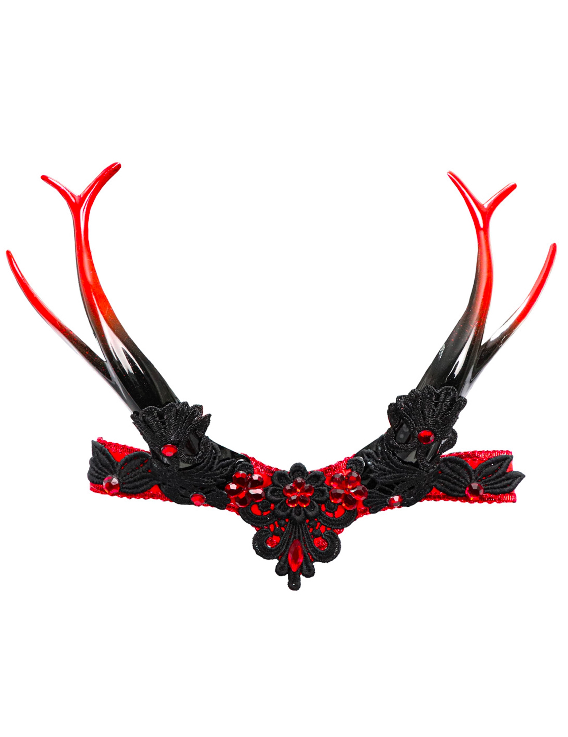 De basis van deze hoofdtooi is een stoffen hoofdband in rood met mooie zwarte bloemendetails in imitatieborduurwerk. Valse rode stenen geven charme aan deze hoofdtooi. Tenslotte zijn er 2 zwarte en rode gewei-achtige hoorns aanwezig.