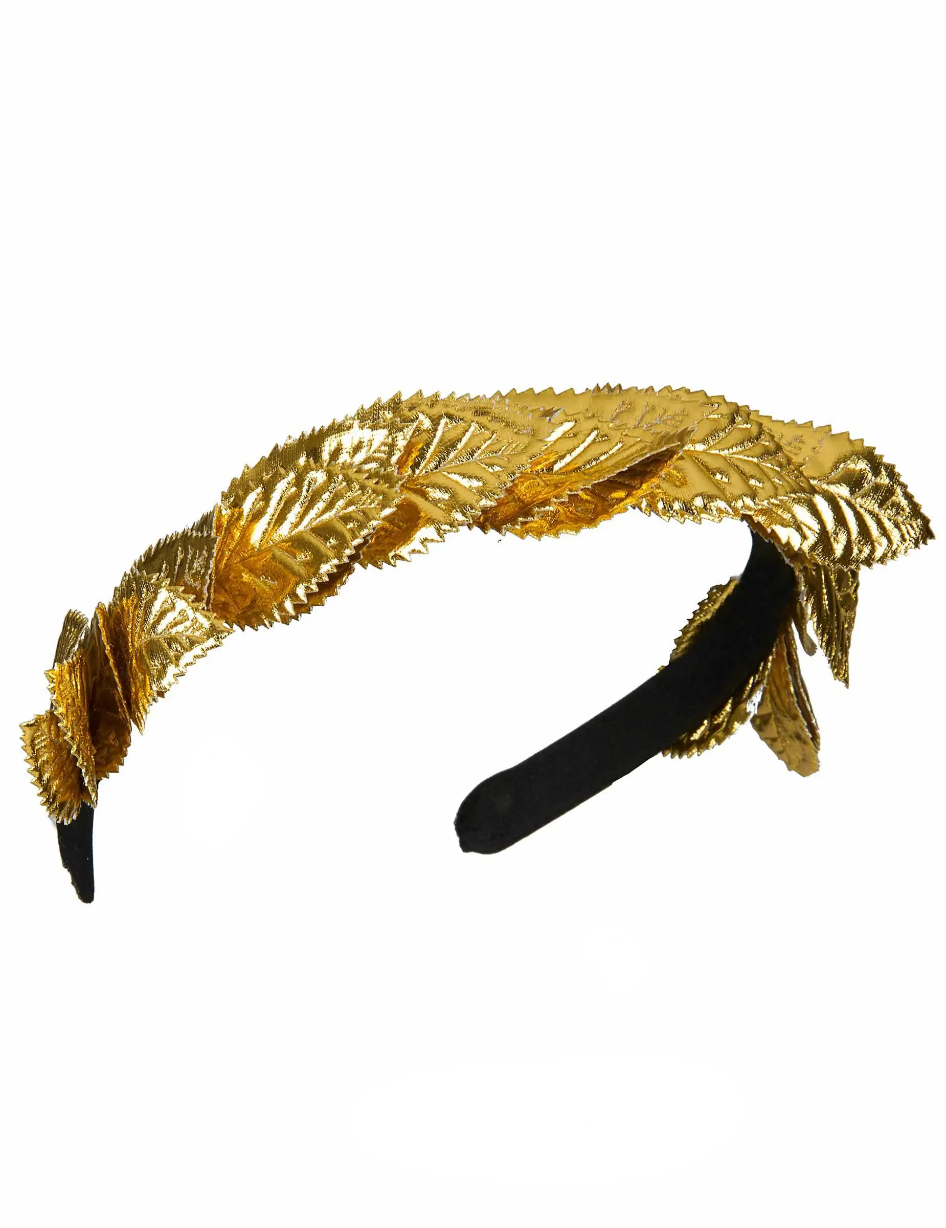 Goudkleurige bladeren zijn op een zwarte haarband bevestigd.