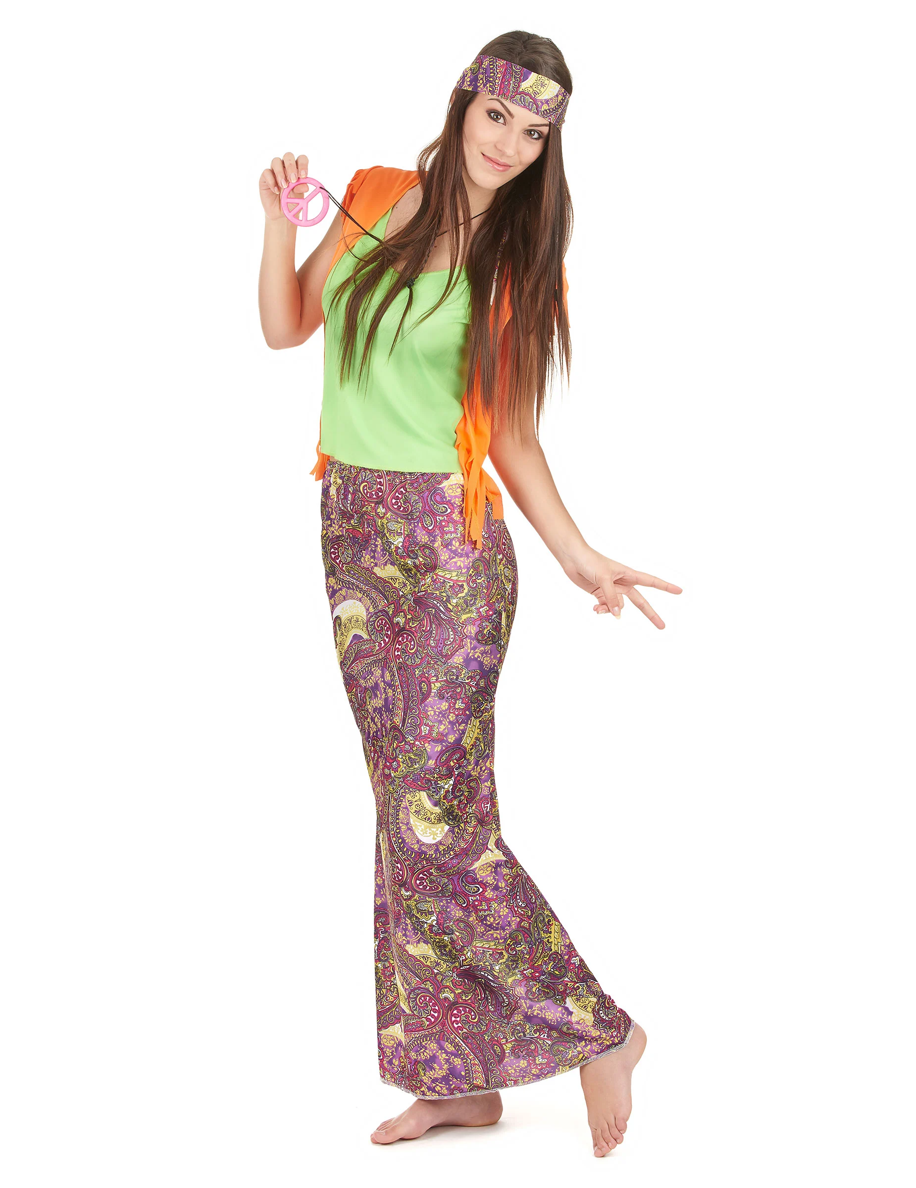Het bovenstuk is groen en is kort. Deze bevat een aangehechte oranje vest met franjes. Het bovenstuk bevat geen mouwen. De kleurrijke rok is bedrukt met hippie motieven. De rok is vrij lang en is elastisch aan de taille voor een perfecte pasvorm.