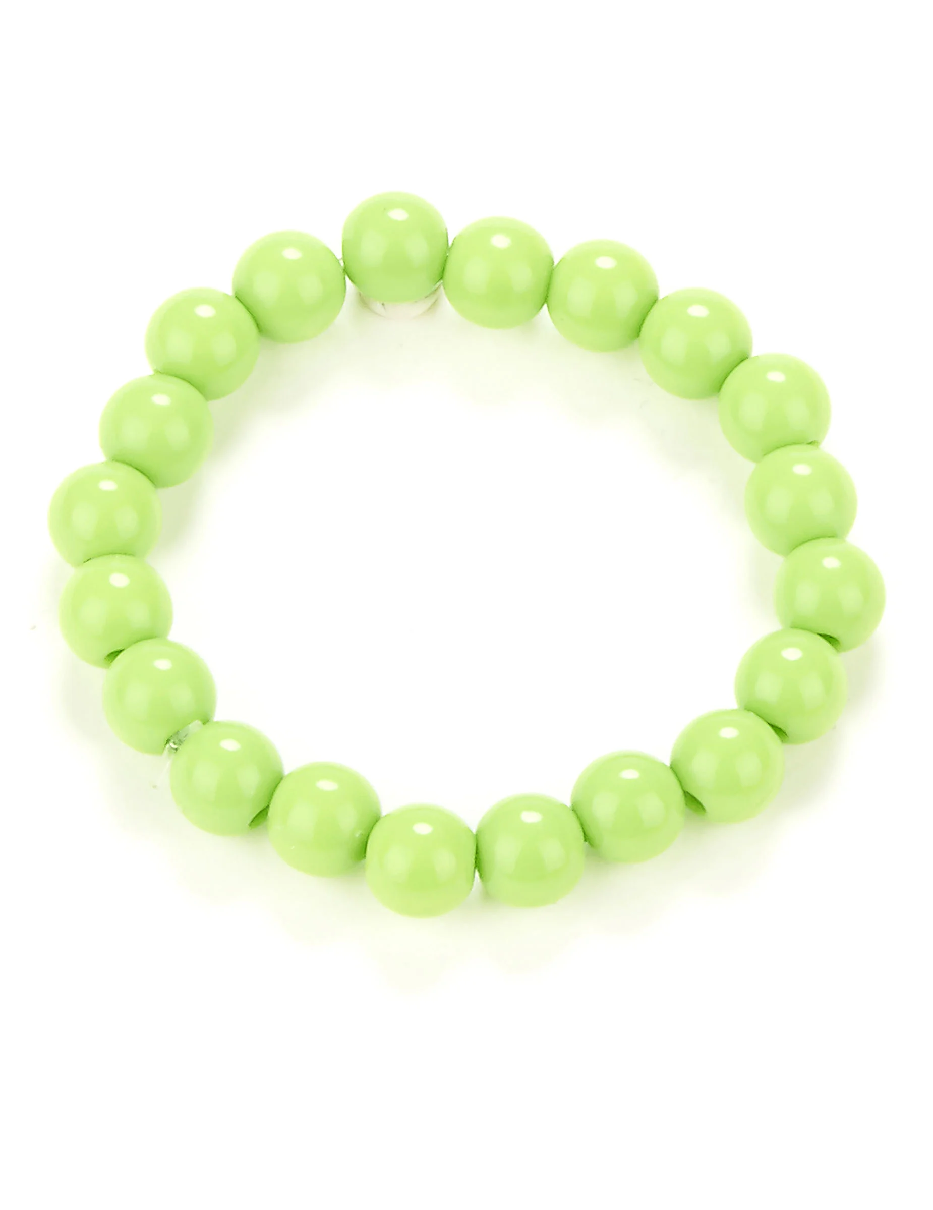 Deze armband voor volwassenen is elastisch. Het is gemaakt van plastic groene kralen. Ze hebben een diameter van ongeveer 1 cm.