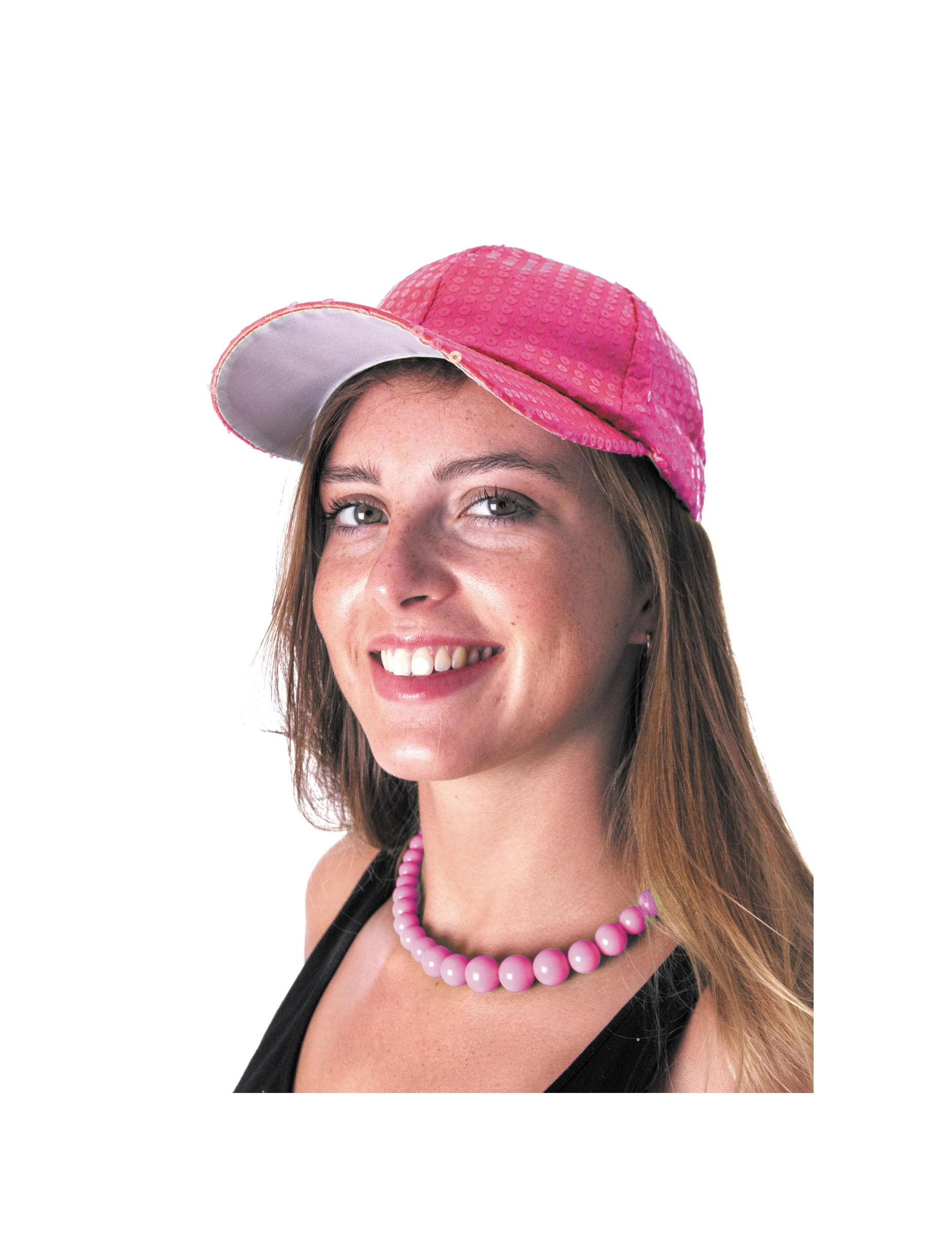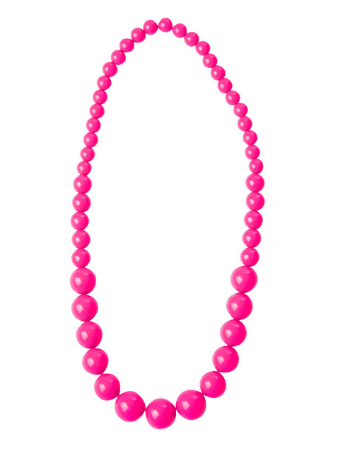 Deze fluo roze ketting bestaat uit grote plastic kralen. Het is ongeveer 50 cm lang.