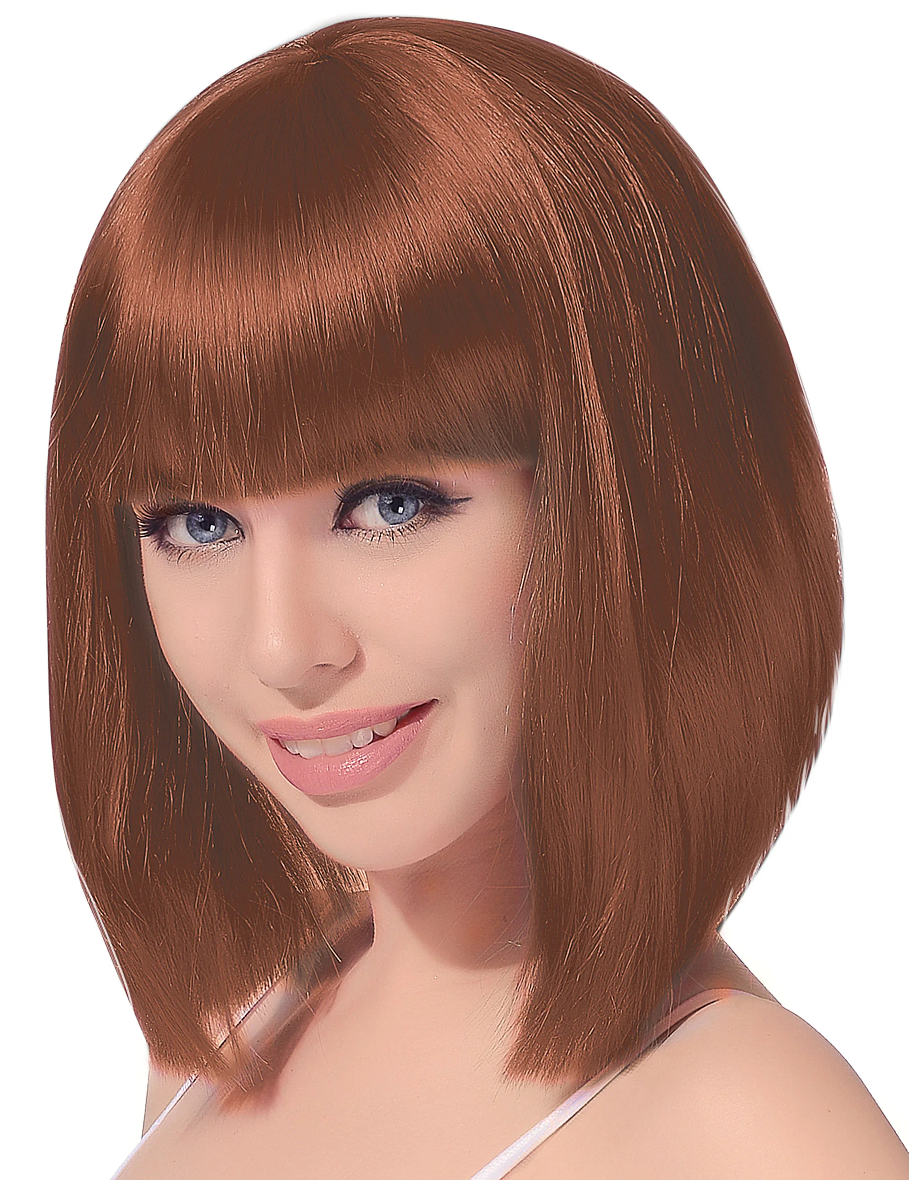 De haren zijn bruin en de pruik bevat een pony aan de voorkant.