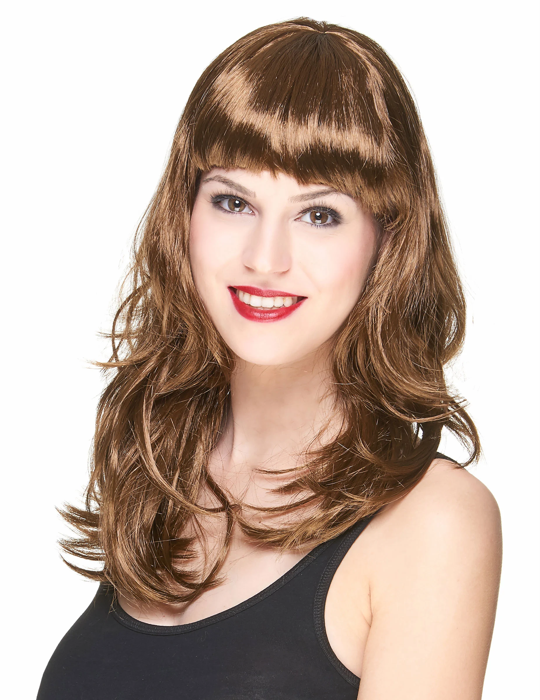 Deze pruik met halflang donkerbruin haar valt tot over de schouders.