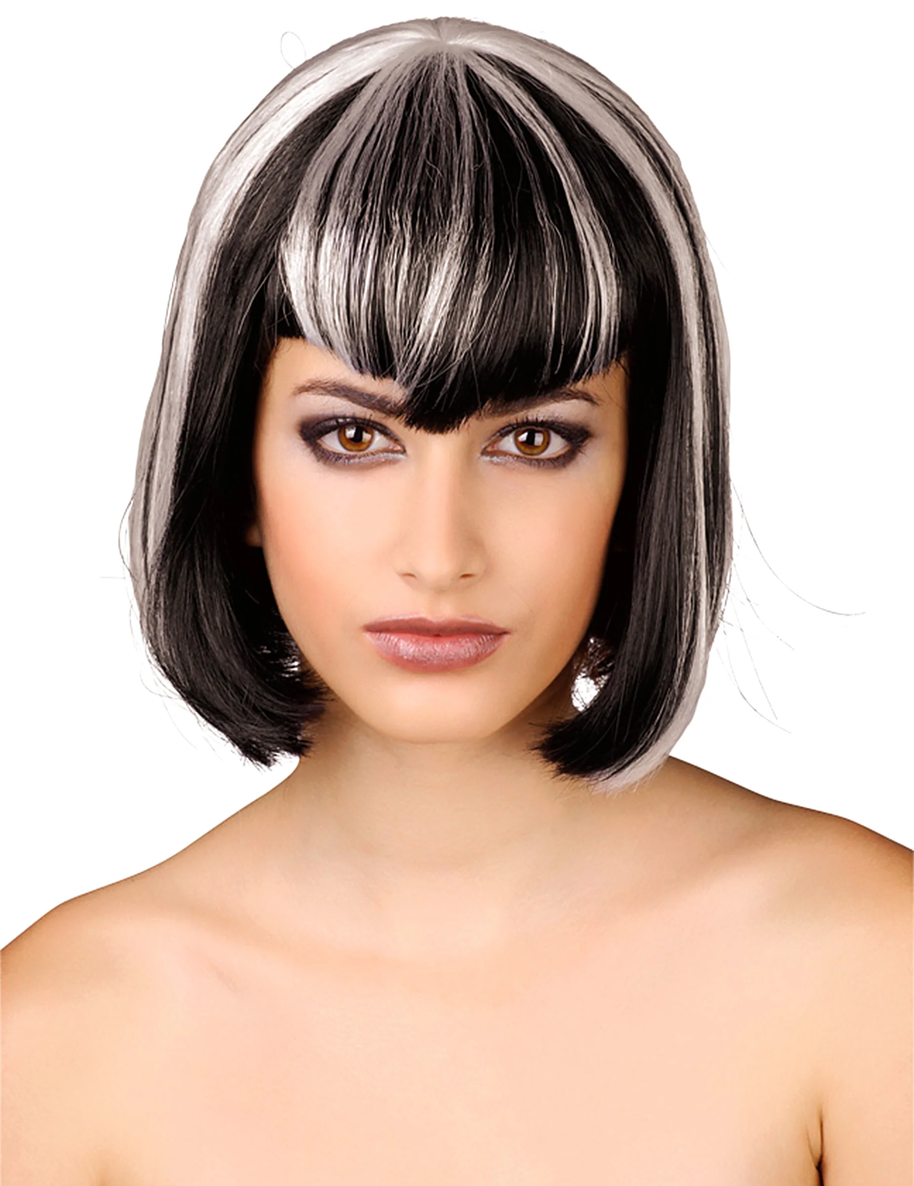 Zwart-witte damespruik met lange sluike haren en pony. Haren tot aan de hals. Past ideaal bij uw vermomming voor een themafeest.
