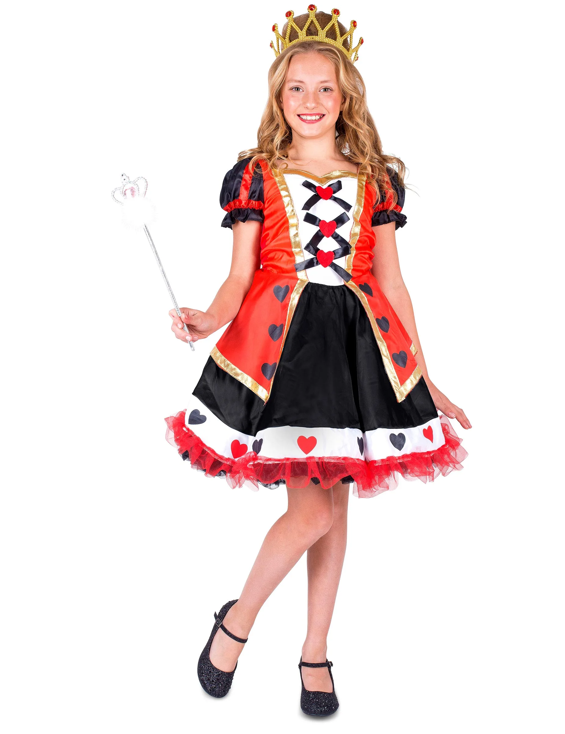 Dit hartenkoningin kostuum voor meisjes bestaat uit een jurk en een kroon. (Scepter en schoenen niet inclusief).