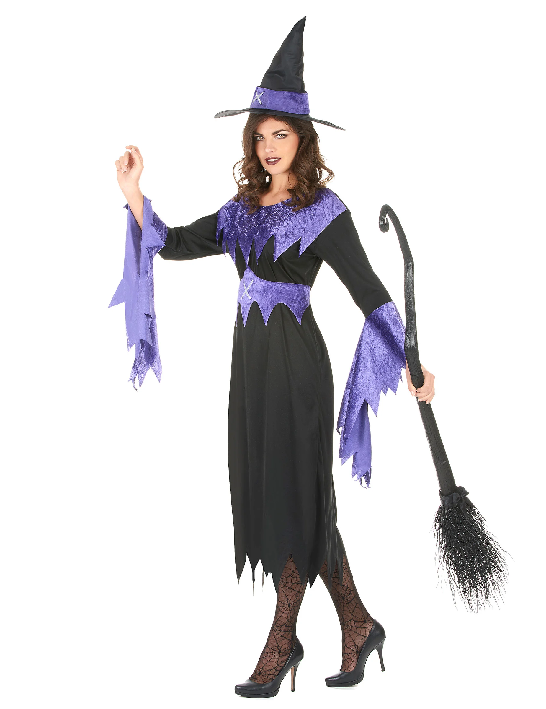 Dit zwart en paars heksen kostuum voor vrouwen bestaat uit een jurk, een riem en een bijpassende hoed (schoenen, panty’s en bezem niet inbegrepen).