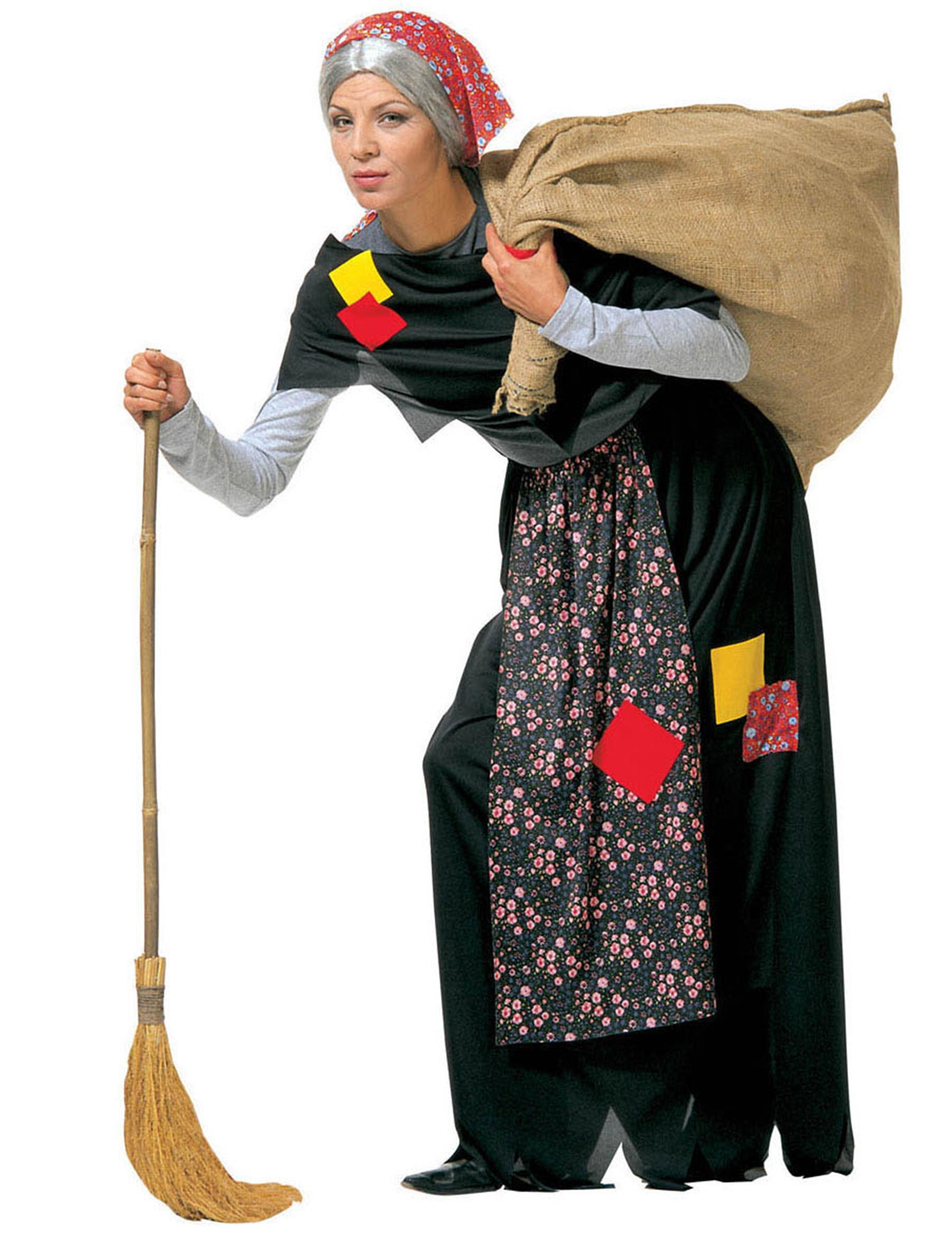 Dit heksenkostuum voor volwassenen bestaat uit een rok, een sjaal en een kap. (Top, zak en bezem niet inbegrepen.)