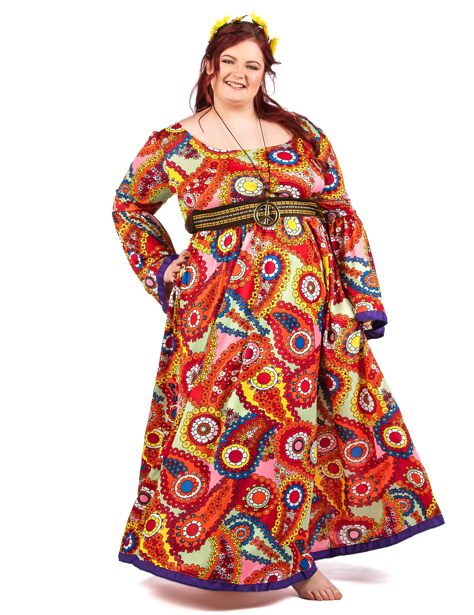 Deze jurk in grote maat is perfect om terug te stappen in de ‘Peace and Love‘ jaren op een themafeest of op Carnaval!