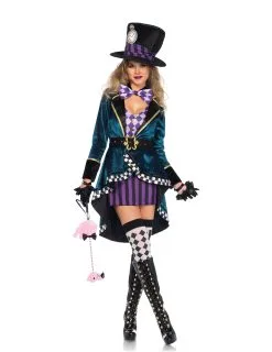 Dit gekke hoedenmaker kostuum voor vrouwen bestaat uit een jurk, een jas, een riem, een strik en een hoed. (Andere accessoires niet inbegrepen.)
