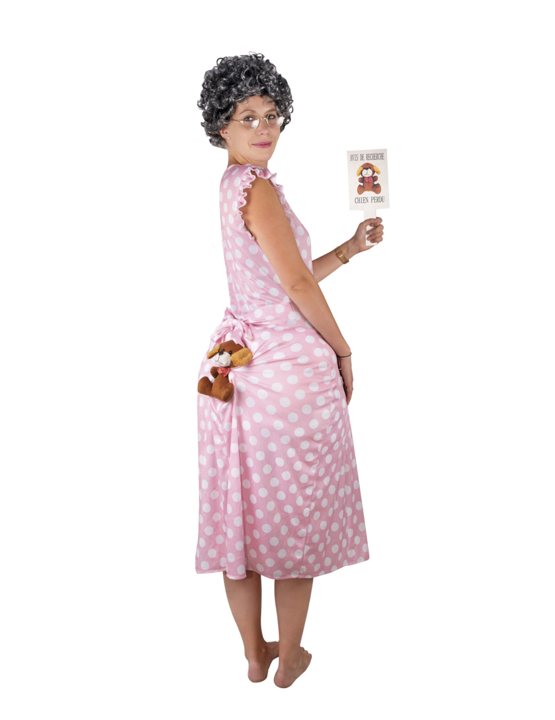 De jurk is roze met witte vlekken. Het heeft korte mouwen met ruches en een klein pluchen hondje is op de rug genaaid.