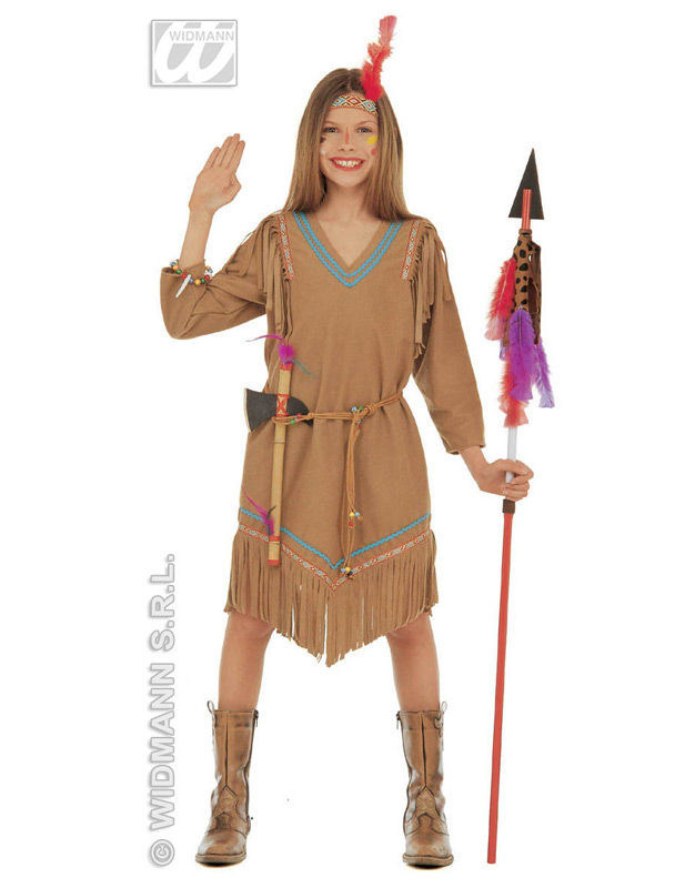 De onderkant van de jurk en de schouders zijn versierd met franjes. De riem bestaat uit een koord die is versierd met kralen wordt om het middel gebonden. De Indianen hoofdband met rode veer maakt dit kostuum compleet!