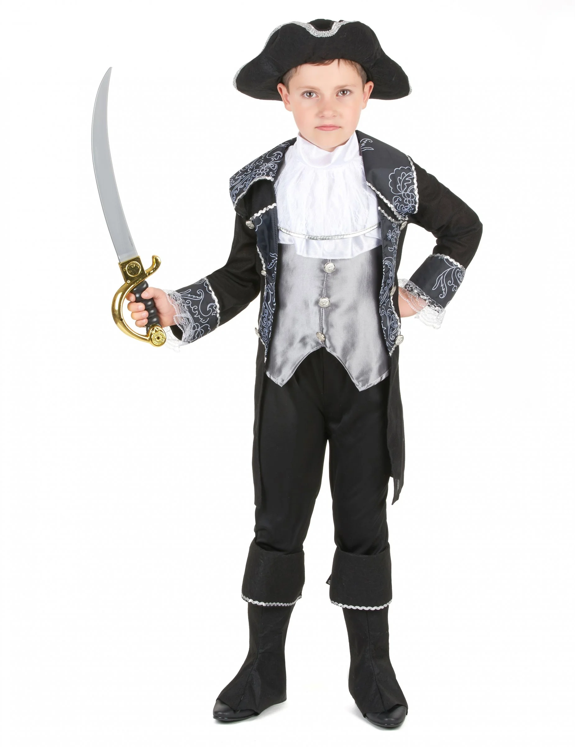 Deze piraten verkleedset voor jongens bestaat uit een vest, een plastron, een hoed en overlaarzen. (Zwaard en broek niet inbegrepen).