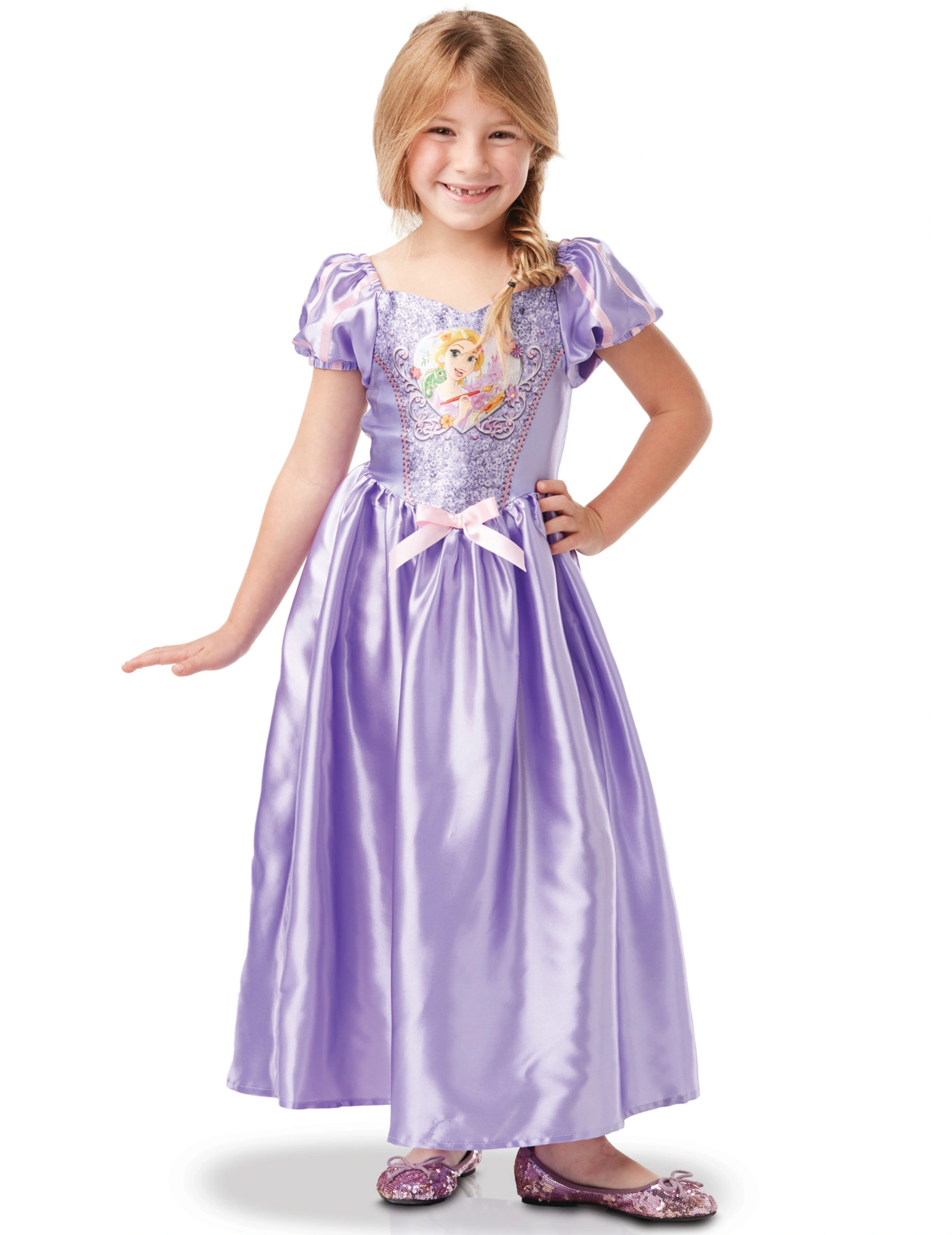 De paarse jurk van een satijnachtige stof heeft de prinses Raponsje™ op de borst gedrukt. Ook is het versierd met een strik aan de voorzijde en heeft het korte pofmouwtjes.