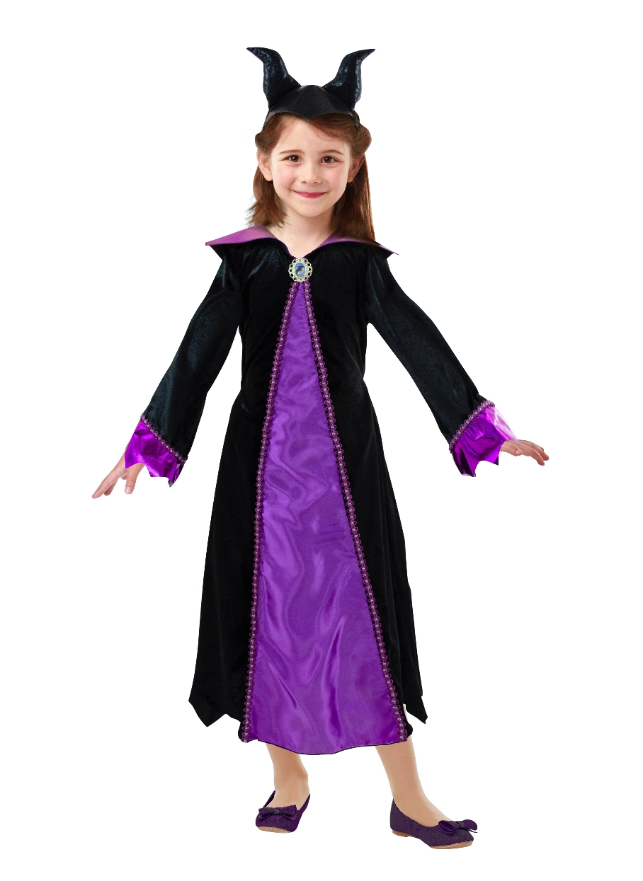 Het kostuum bestaat uit een jurk en een hoofdband. De jurk is paars en zwart met een kap. Het is enkellang en heeft lange mouwen met paars aan de uiteinden. De hoofdband stelt de zwarte hoorns voor van het personage van Maleficent. Schoenen zijn niet inbegrepen.