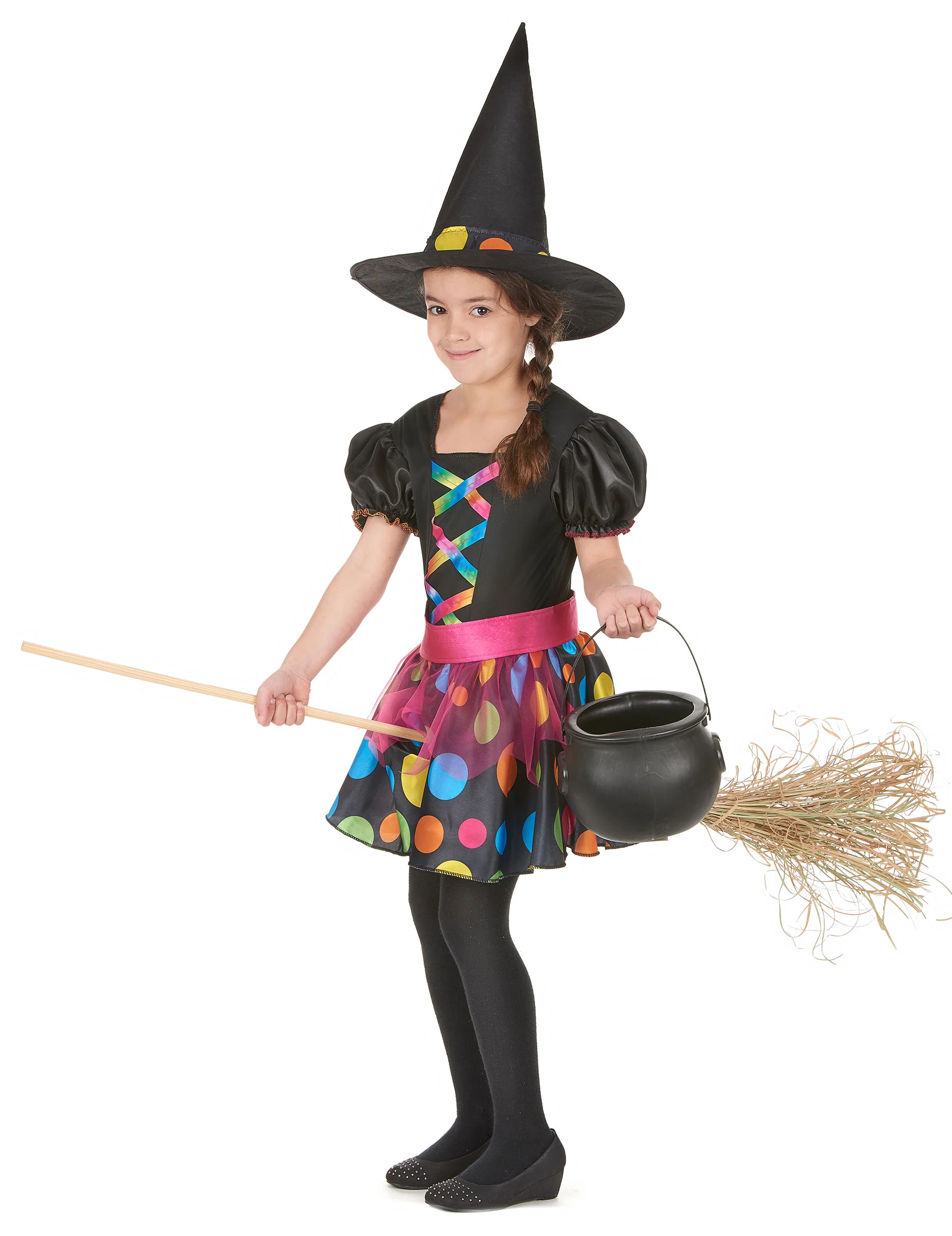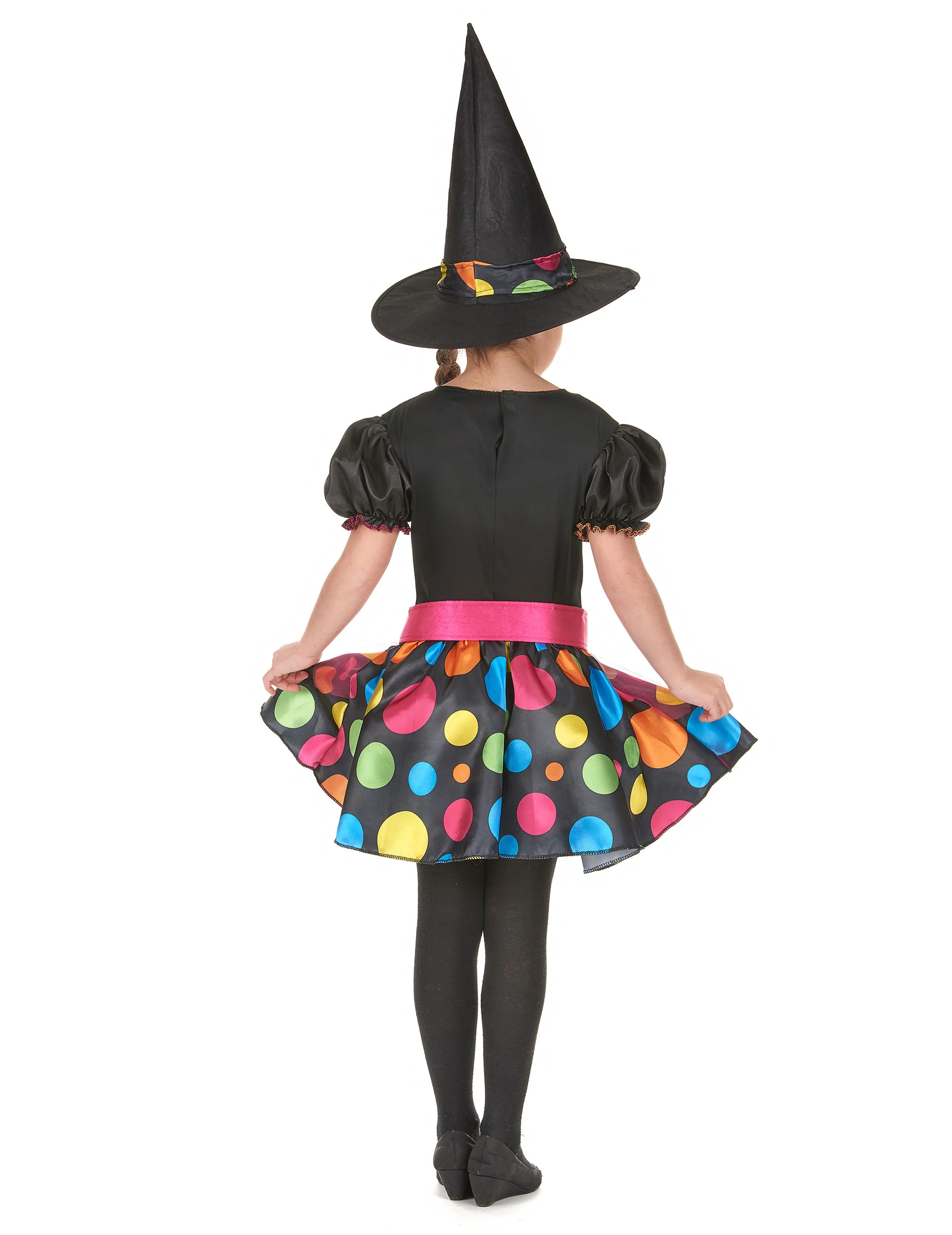 Dit heksenkostuum is voor meisjes en bestaat uit een jurk, een riem en een hoed. (Ketel, bezem, legging en schoenen niet inbegrepen.) De jurk is zwart met verschillende gekleurde stippen. De pofmouwen zijn kort. De rok heeft veel volume dankzij de kleine onderrok van vilt. De voorkant van de jurk is versierd met een neppe vetering.